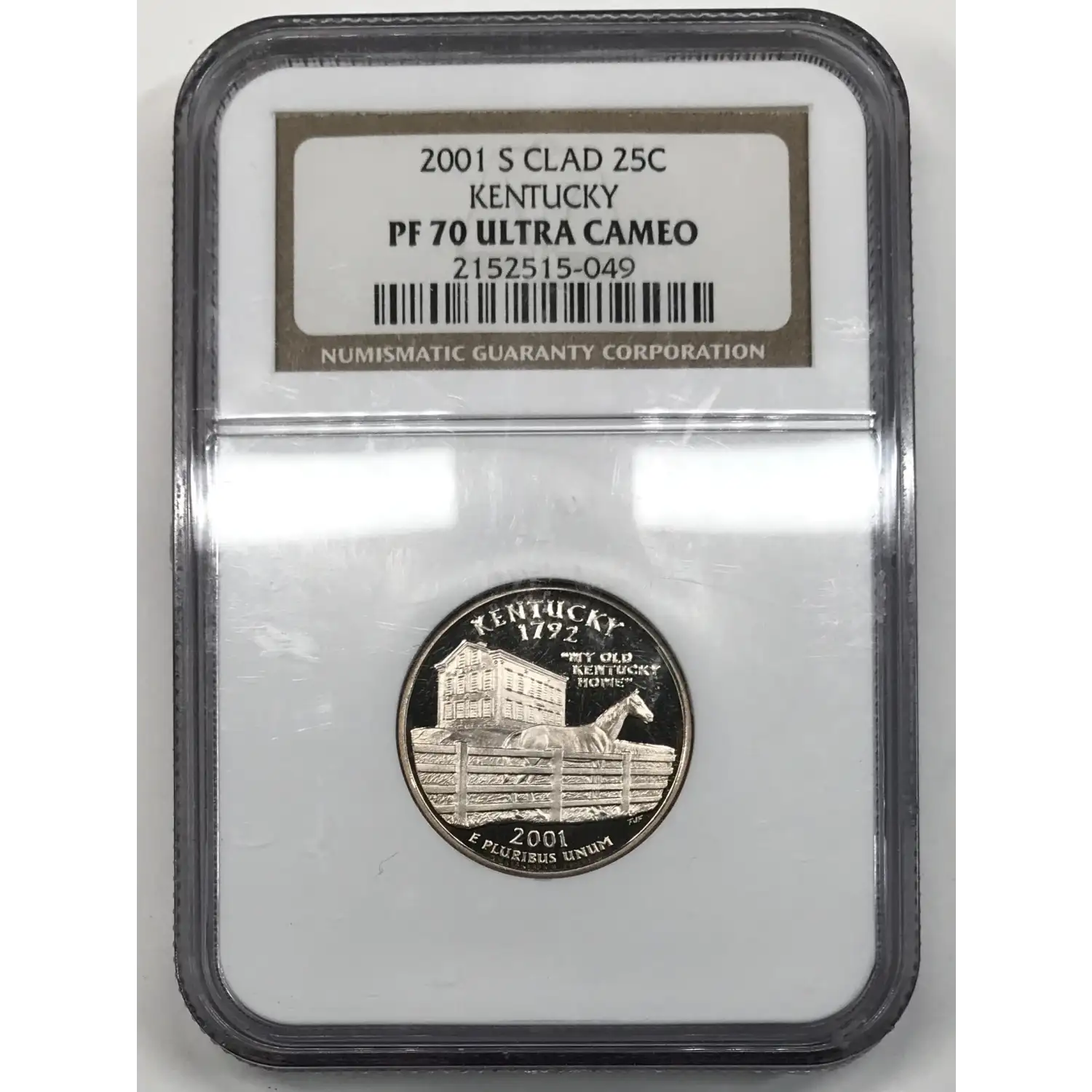 2001-S Proof Clad Kentucky State Quarter NGC PF-70 ULTRA CAMEO - sticker on back of slab