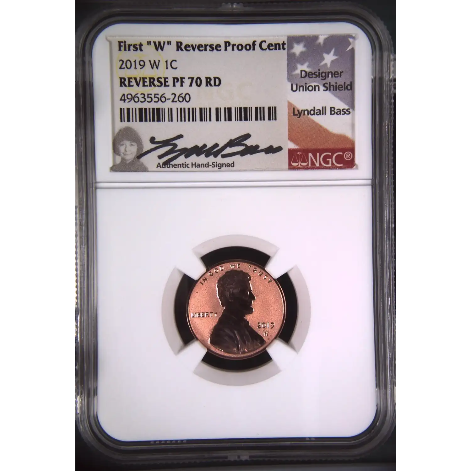 2019-W Reverse Proof Lincoln Shield Cent NGC PF-70 RD - Lyndall Bass (Union Shield Reverse Designer) Signature Label - First "W" Reverse Proof Cent