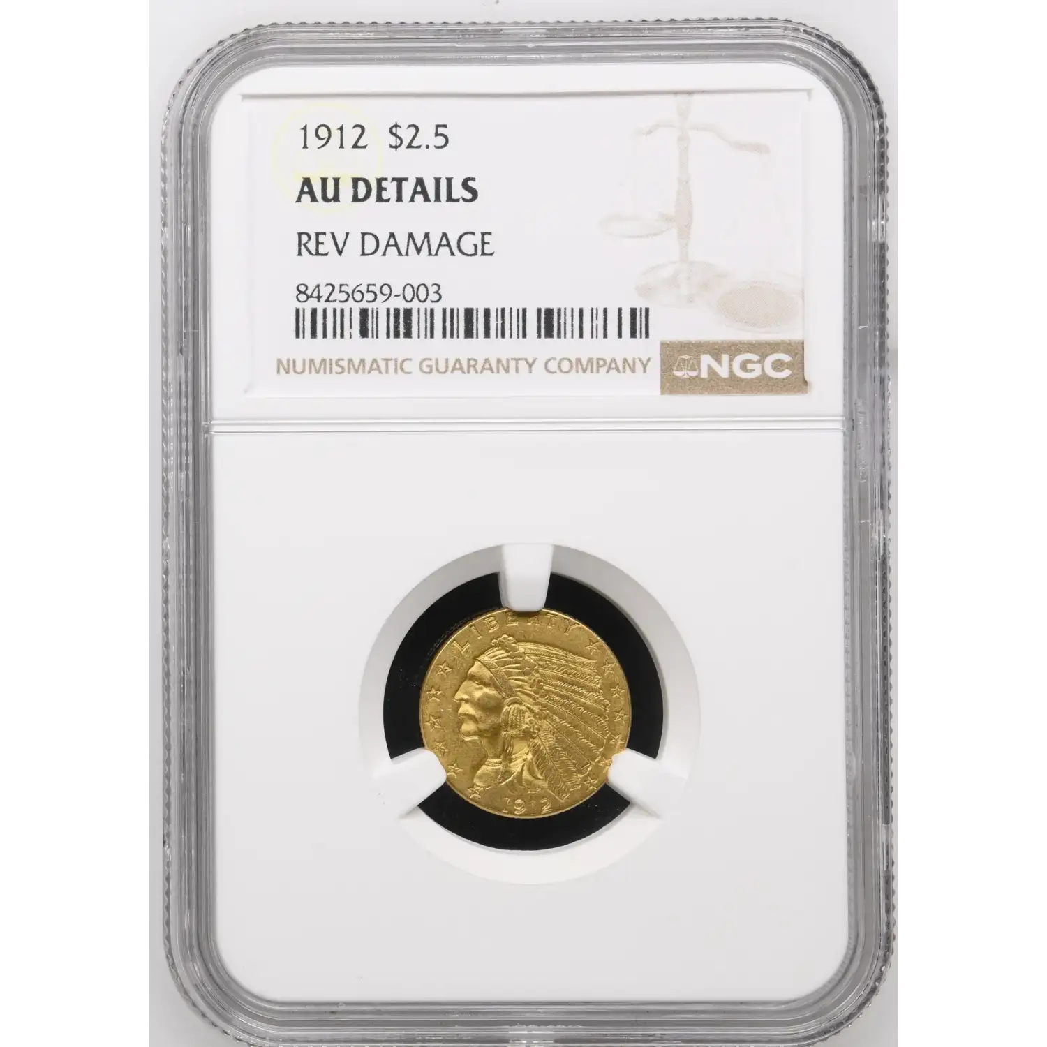 1912 P $2.50 Gold Indian Head Quarter Eagle NGC AU Details (rev damage) - test cut at 9 o'clock