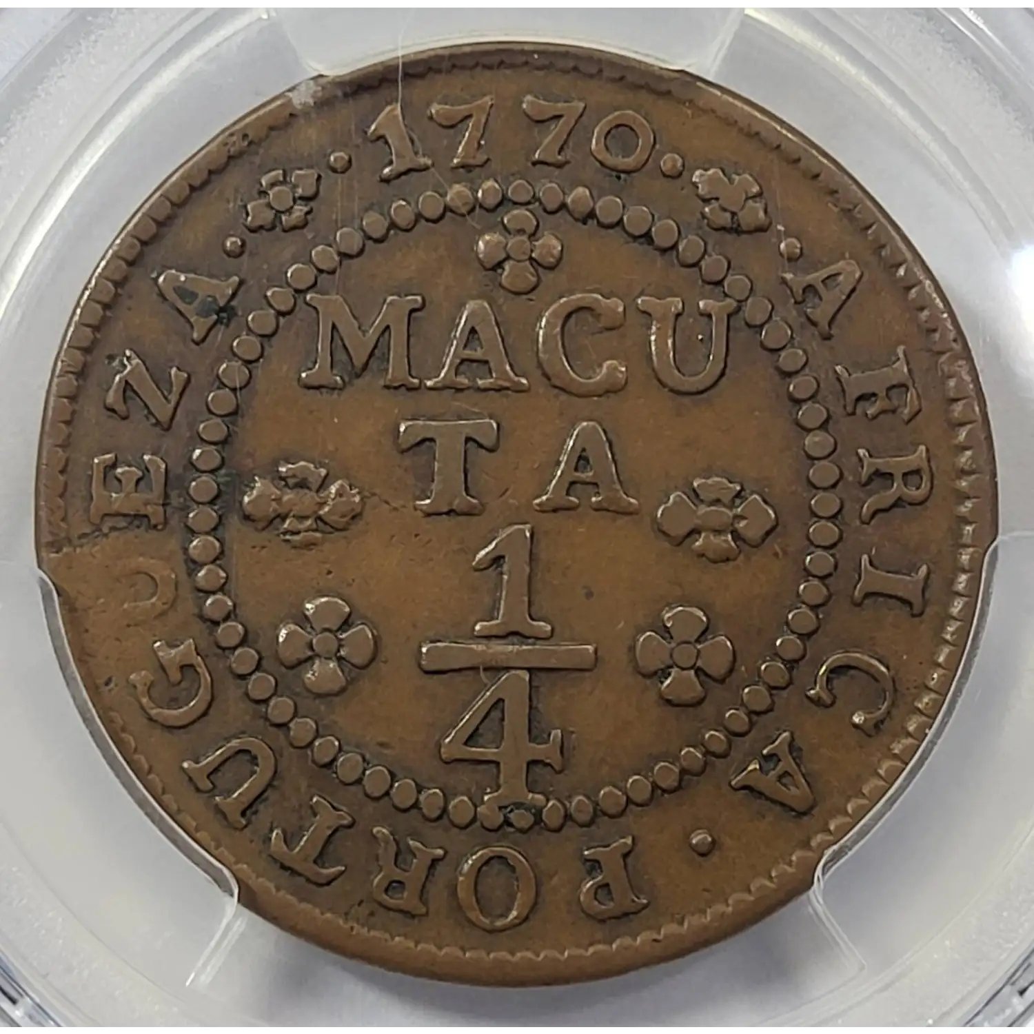 1770 ANGOLA Copper 1/4 MACUTA PCGS XF-40 Richard August Collection KM#10