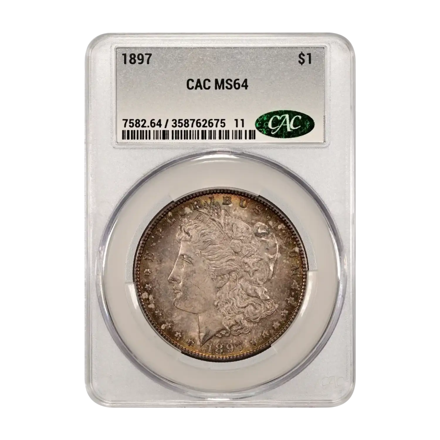 1897-P Morgan Silver Dollar CAC Grading (CACG) MS 64 - Dark Rainbow Toning Reverse Rim