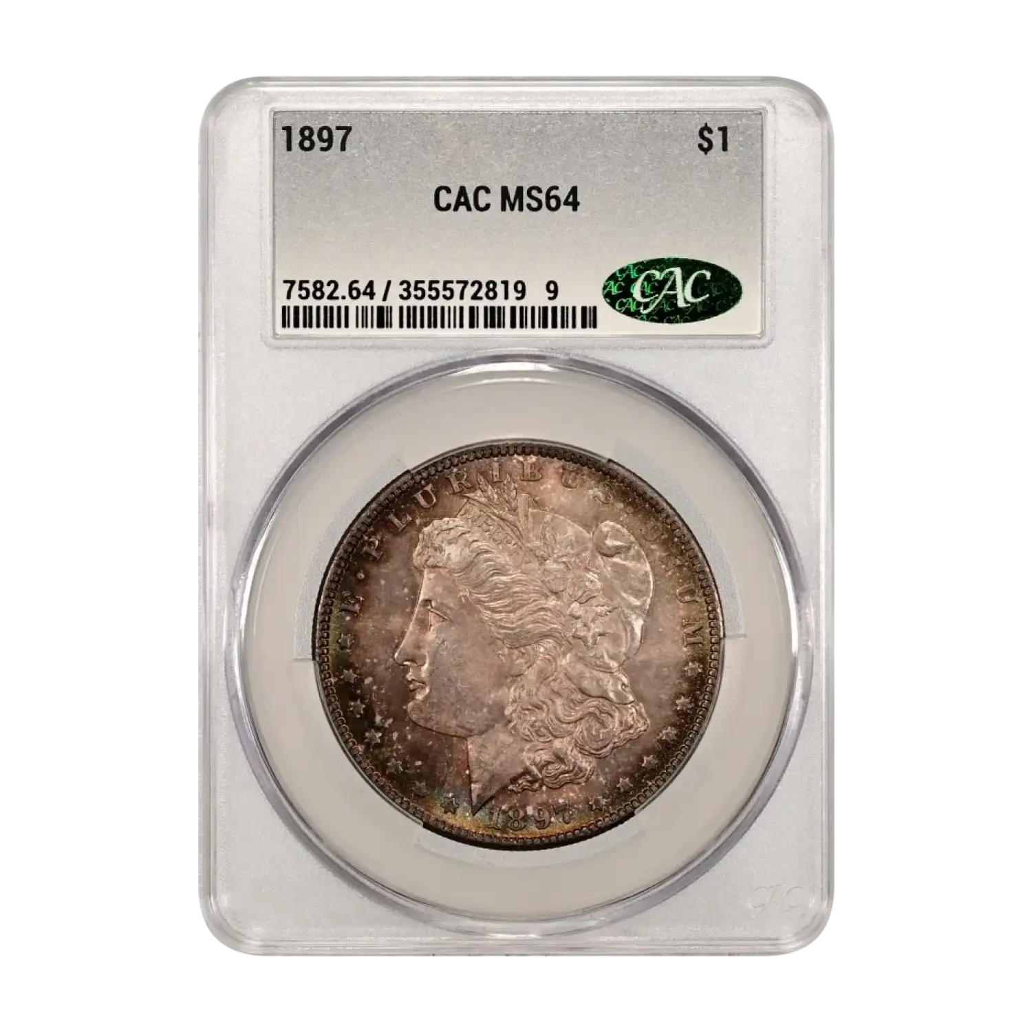 1897-P Morgan Silver Dollar CAC Grading (CACG) MS 64 - Dark Rainbow Toning