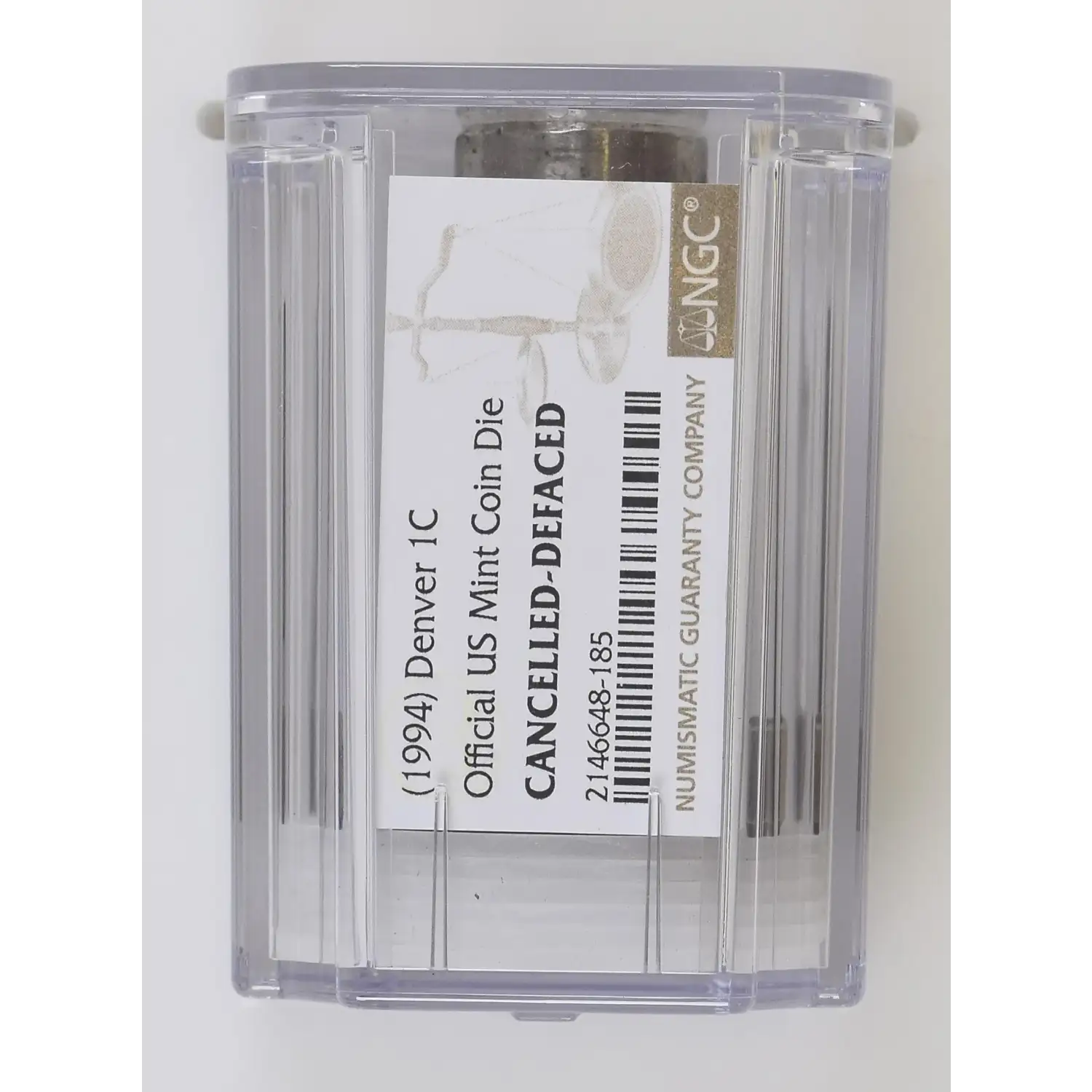 (1994) Denver (D) Lincoln Memorial Cent (1c) Official US Mint Coin Die NGC CANCELLED-DEFACED - note that NGC did not design the "slab" well and the die can move around in the enclosure, sometimes causing the writing on the end of the die to smear