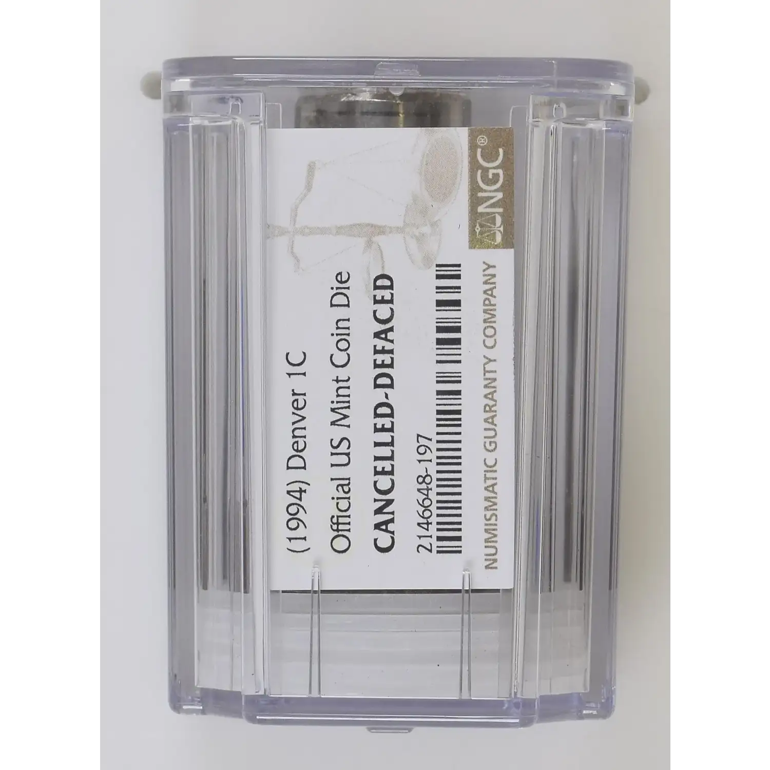 (1994) Denver (D) Lincoln Memorial Cent (1c) Official US Mint Coin Die NGC CANCELLED-DEFACED - note that NGC did not design the "slab" well and the die can move around in the enclosure, sometimes causing the writing on the end of the die to smear