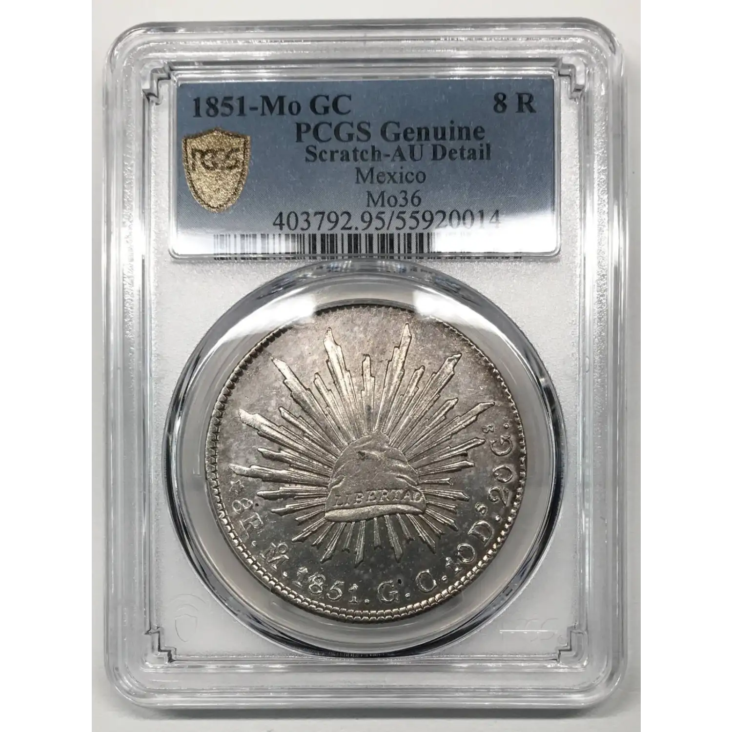 1851-Mo GC Mexico Silver 8 REALES PCGS Genuine - AU Details (95 - Scratch) Mo36