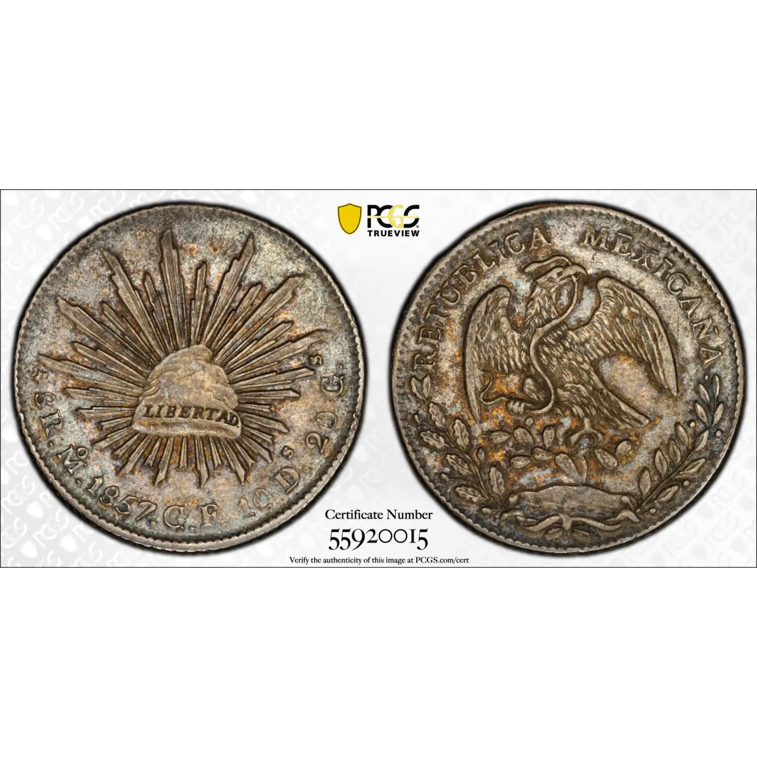 1857-Mo GF Mexico Silver 8 REALES PCGS Genuine - AU Details (97 - Environmental Damage) Mo43