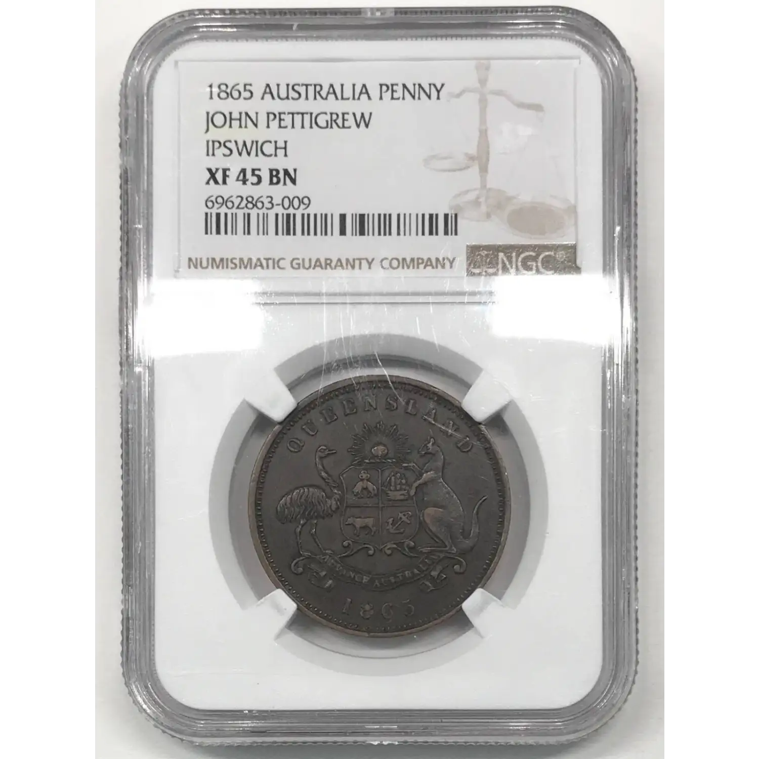 1865 Token NGC XF-45 BN JOHN PETTIGREW IPSWICH AUSTRALIA PENNY
