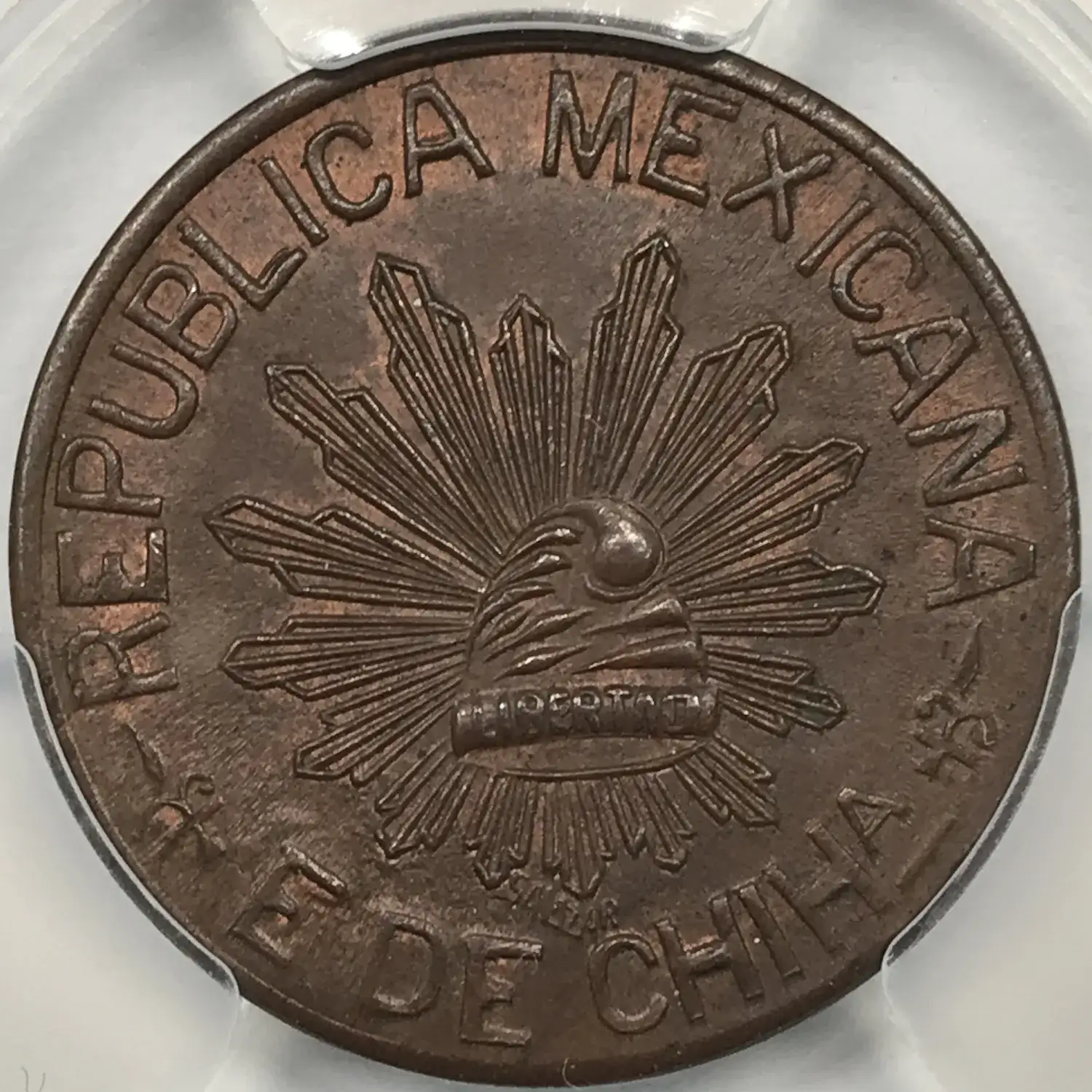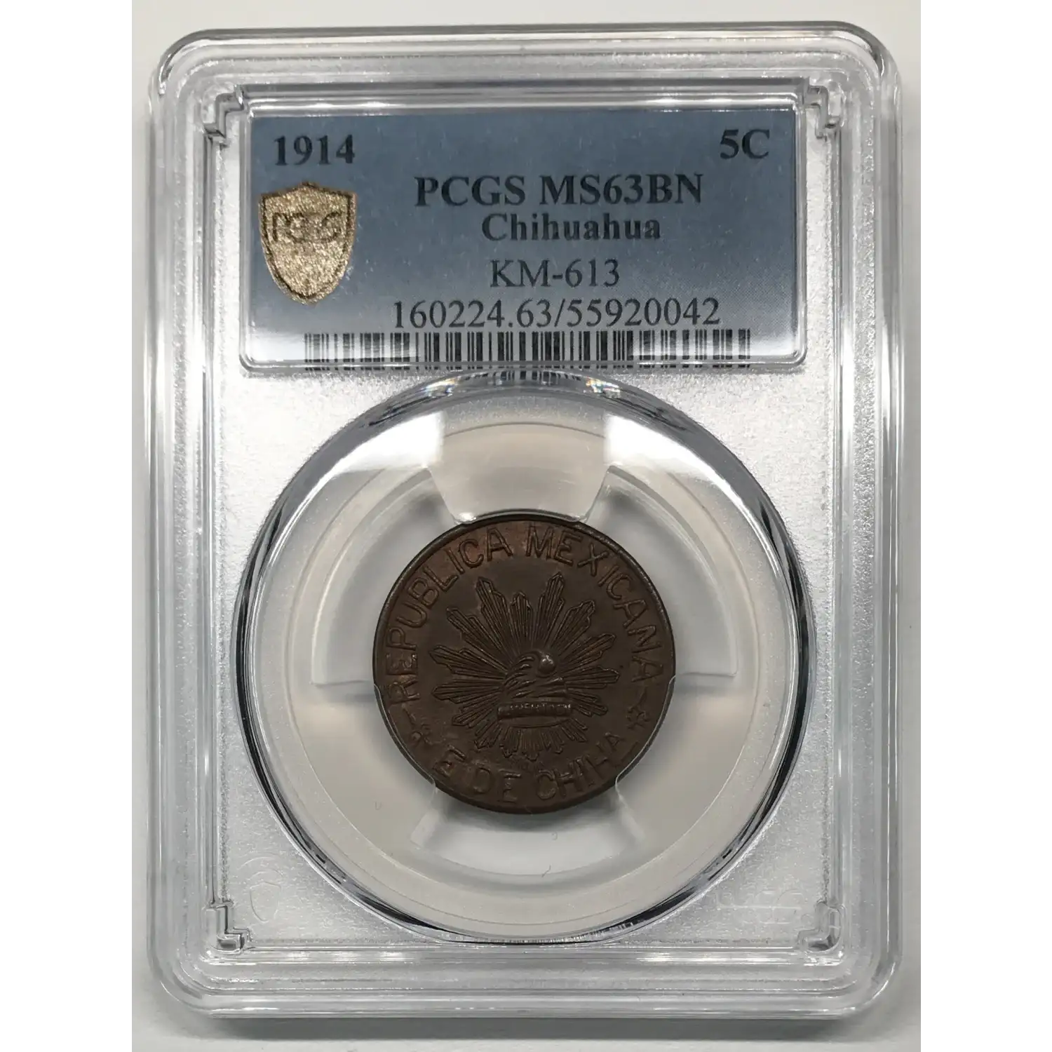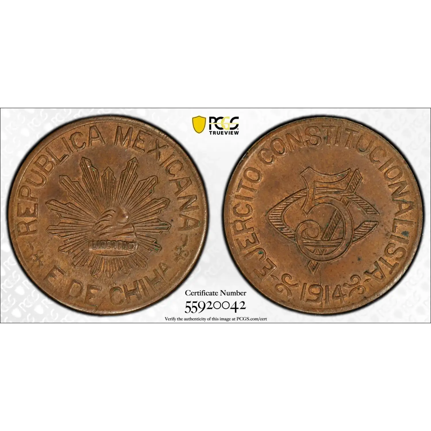 1914 MEXICO-REVOLUTIONARY Copper 5 CENTAVOS PCGS MS-63 BN Chihuahua KM-613