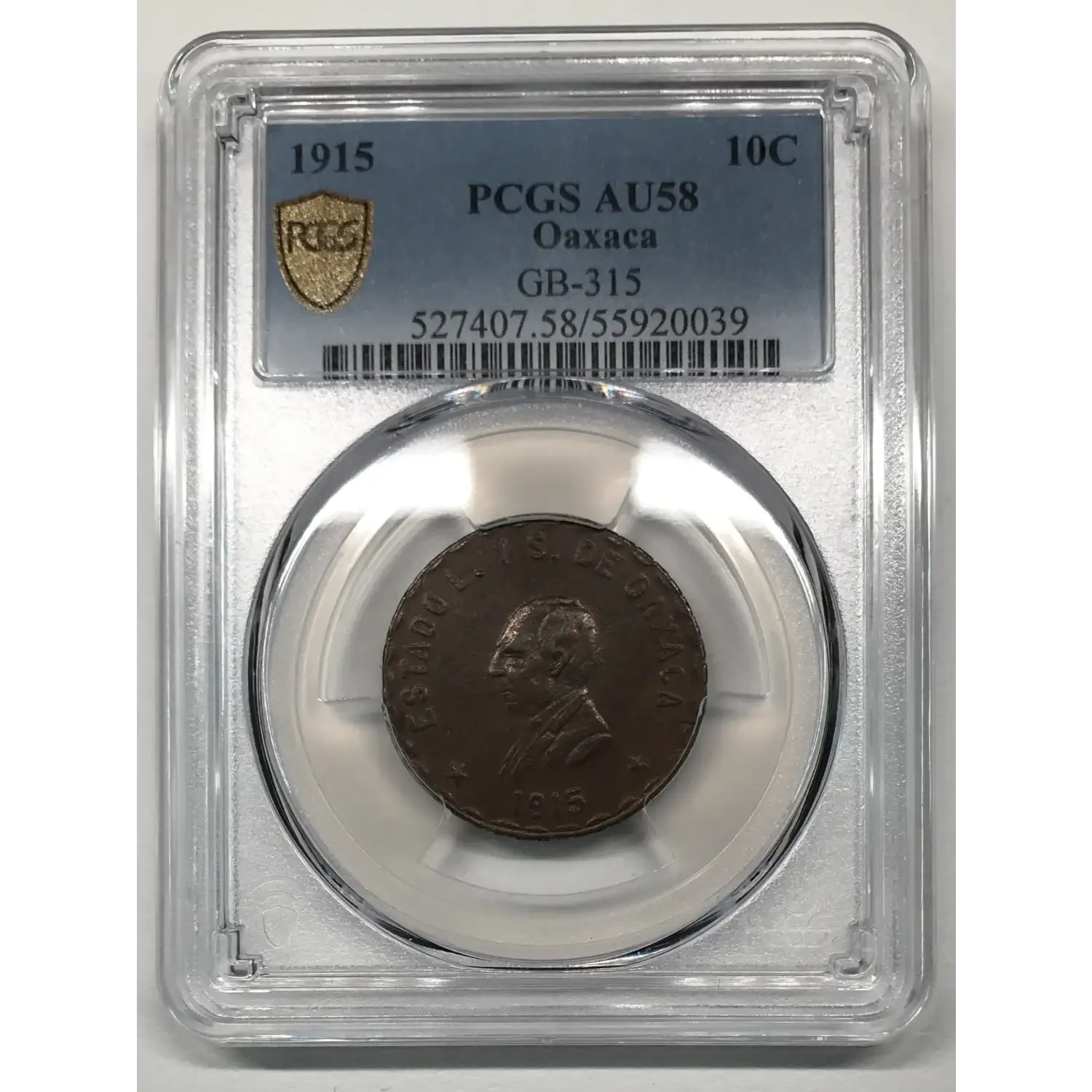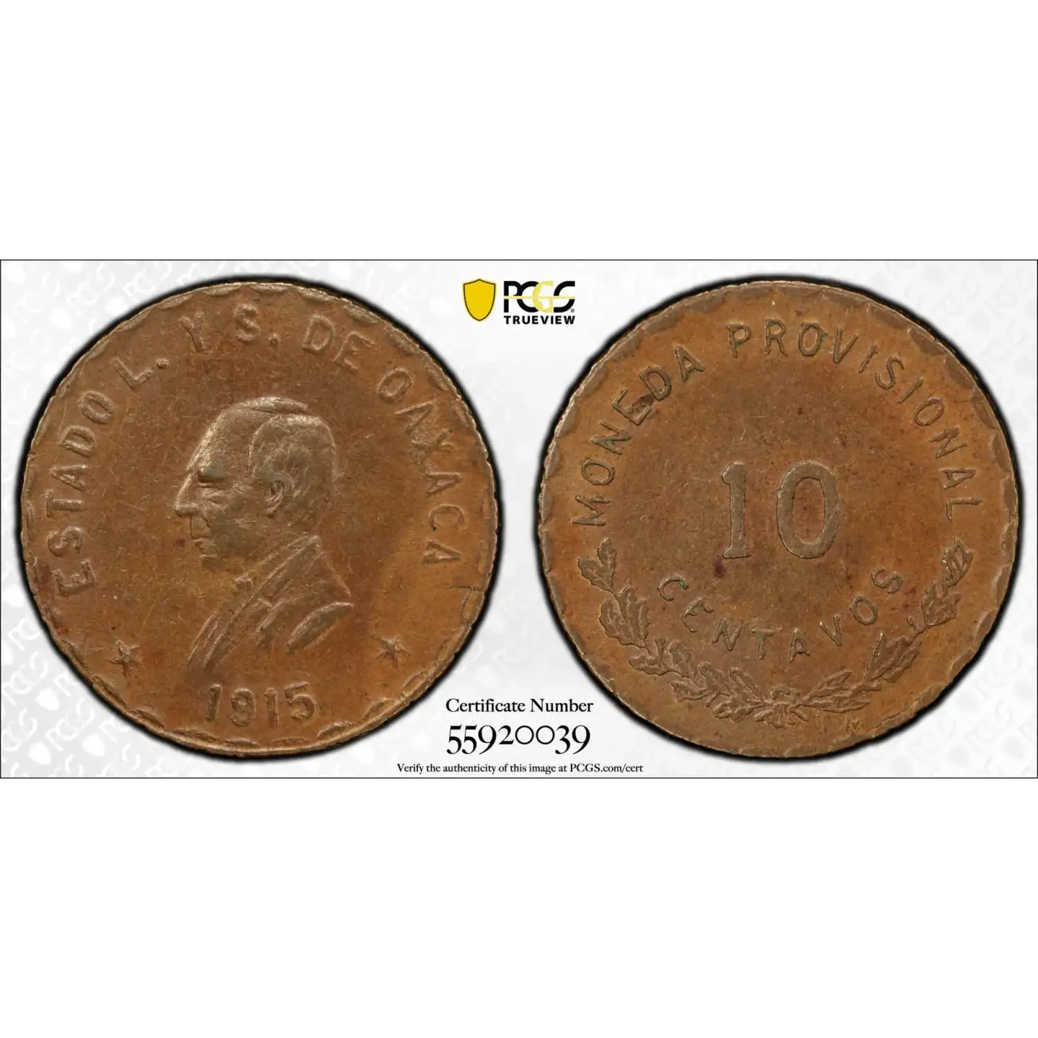 1915 MEXICO-REVOLUTIONARY Copper 10 CENTAVOS PCGS AU-58 BN Oaxaca GB-315 KM-724