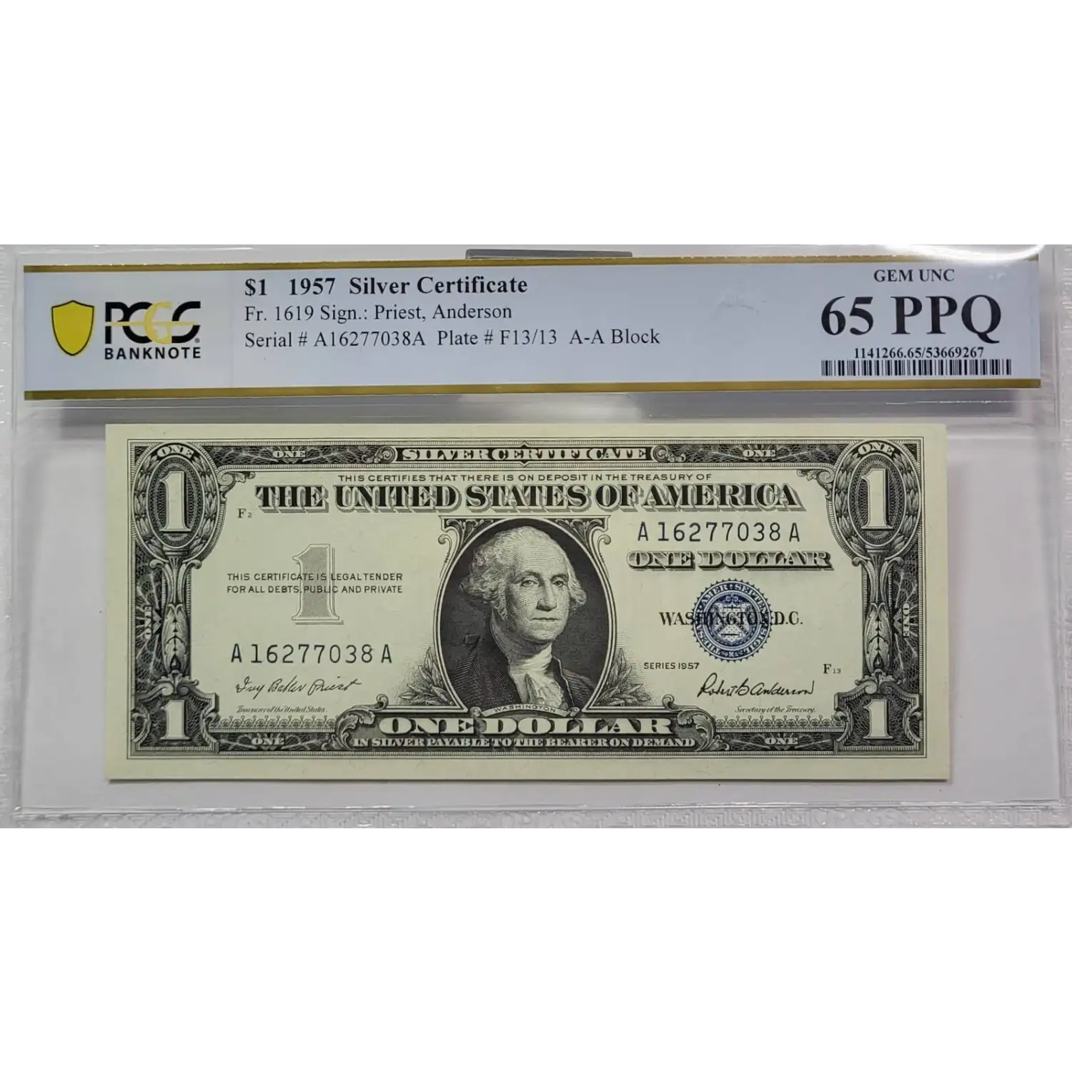 1957 $1 Blue Seal Small Silver Certificate Note Fr. 1619 PCGS 65 PPQ