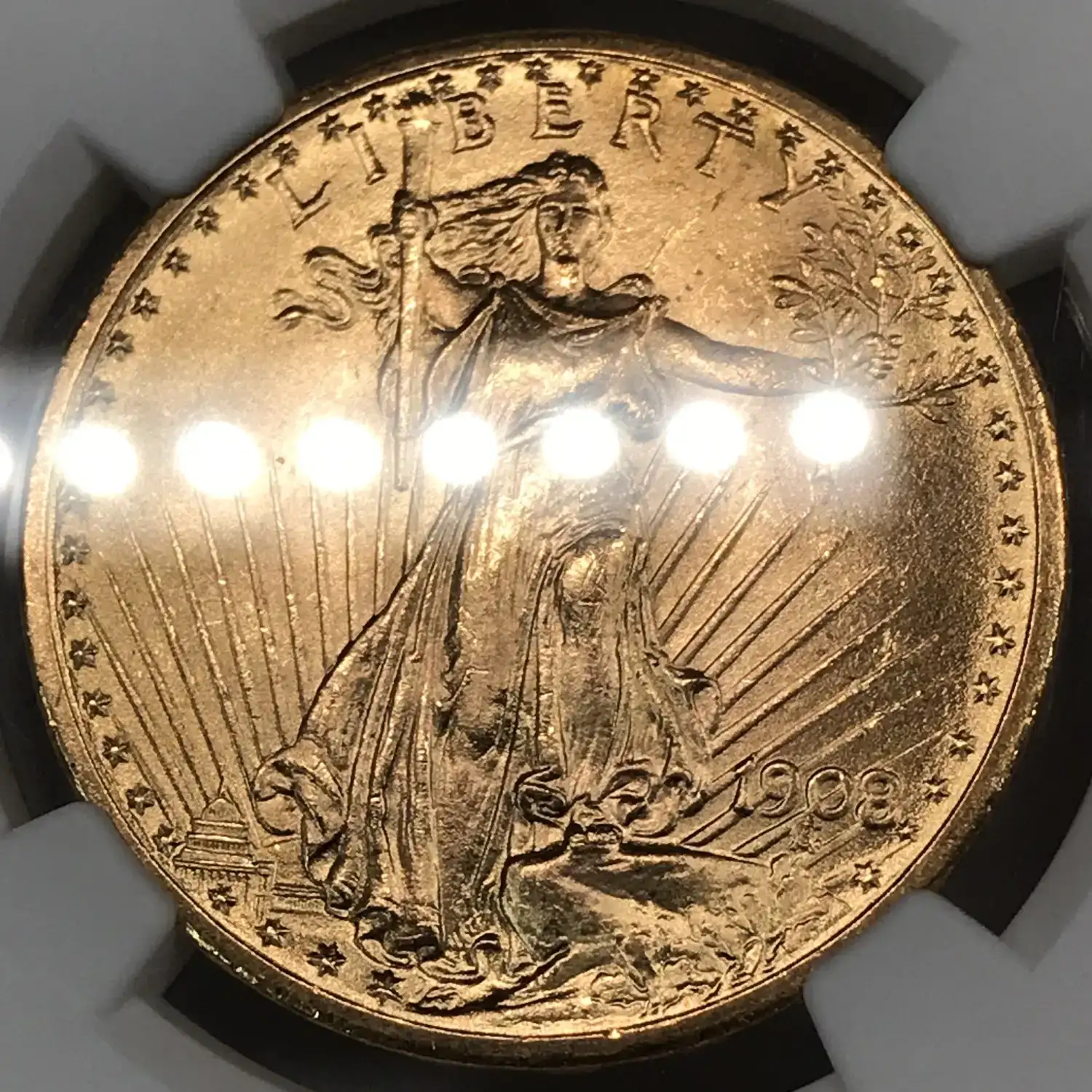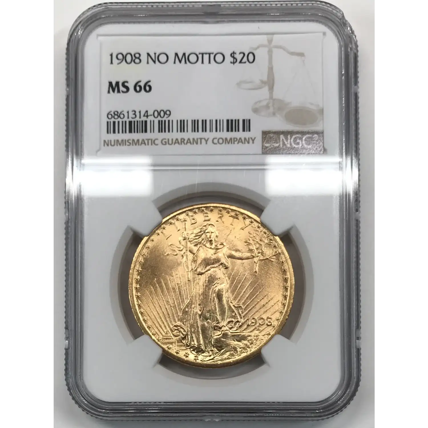 1908 P NO MOTTO Saint Gaudens $20 Gold Double Eagle NGC MS-66 - minor slab chipping top right corner