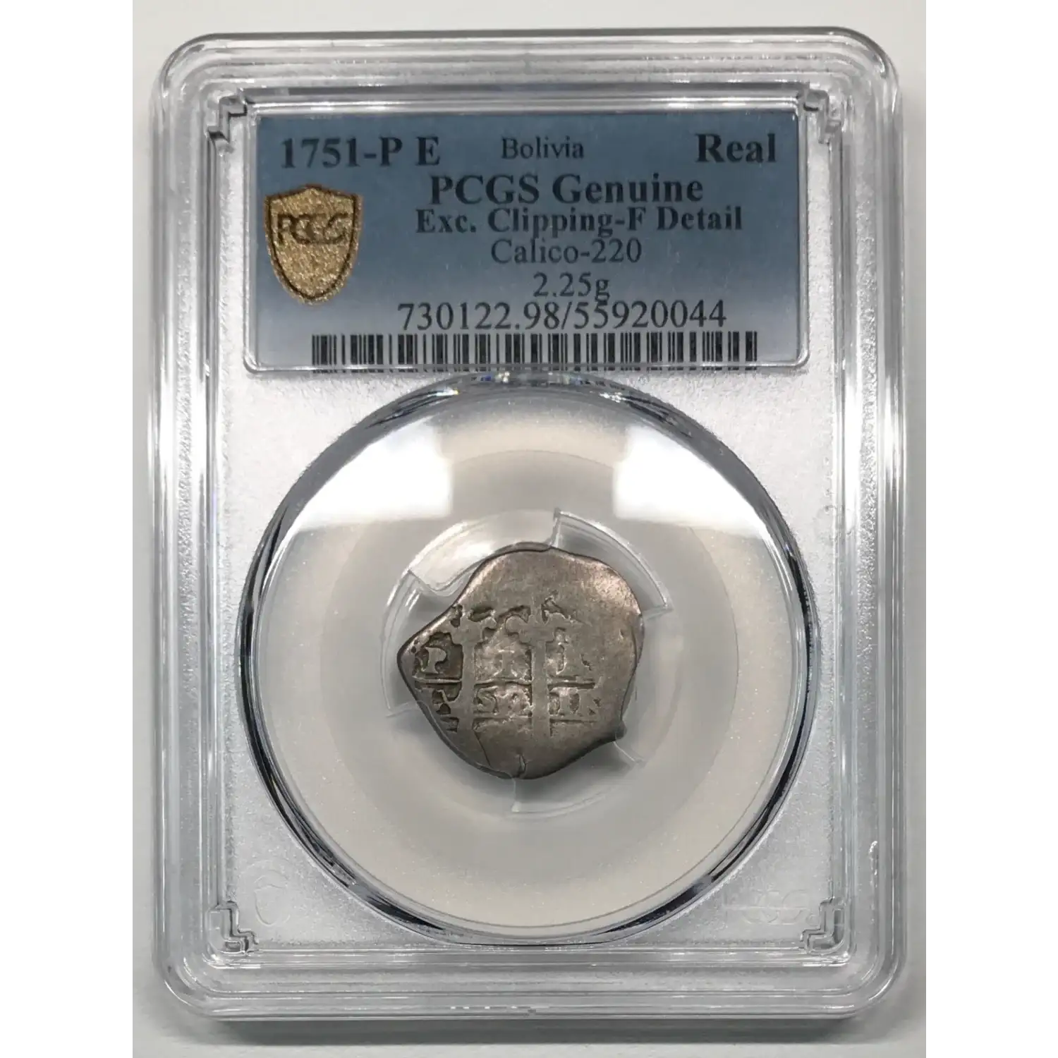 1751-P E BOLIVIA Silver REAL PCGS Genuine - Fine Details (98 - Damage) Calico-220