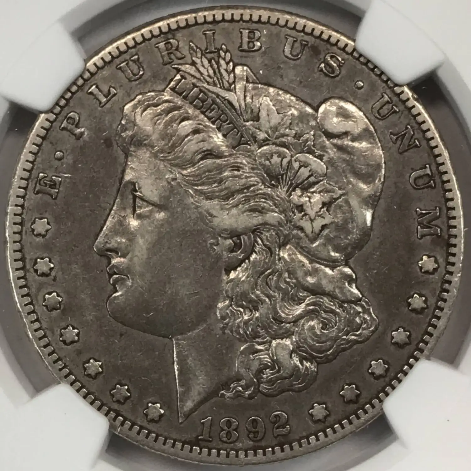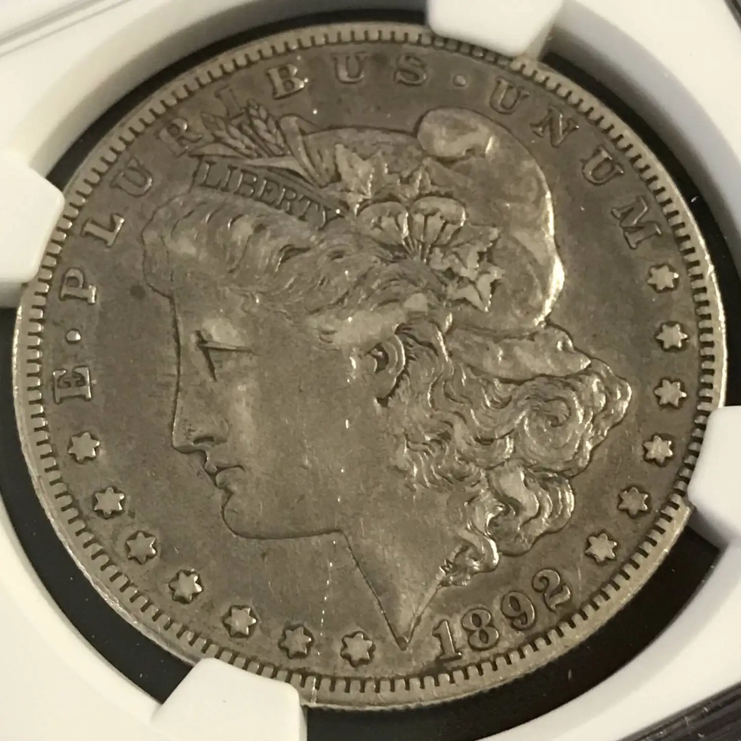 1892 S Morgan Silver Dollar NGC VF Details (obv. damage) - nice VF coin despite details grade - damage they are calling out is hard to see at most light angles, took a while to find it - peforated marks/scratches go from 2nd left star, through cheek & hair, to B of PLURIBUS (see photo)