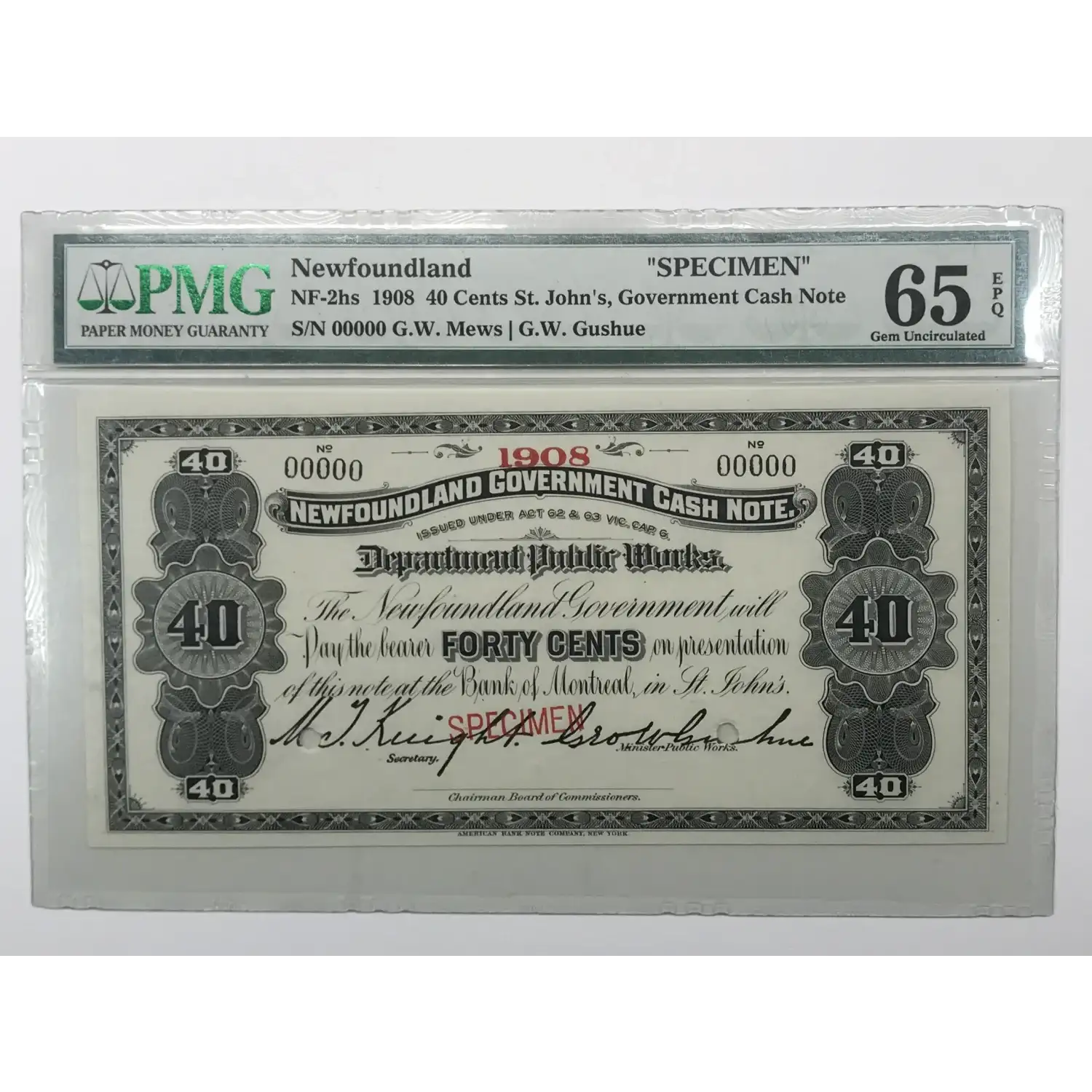 1908 Newfoundland 40¢ Cents St John's Government Cash Note SPECIMEN PMG 65 EPQ
