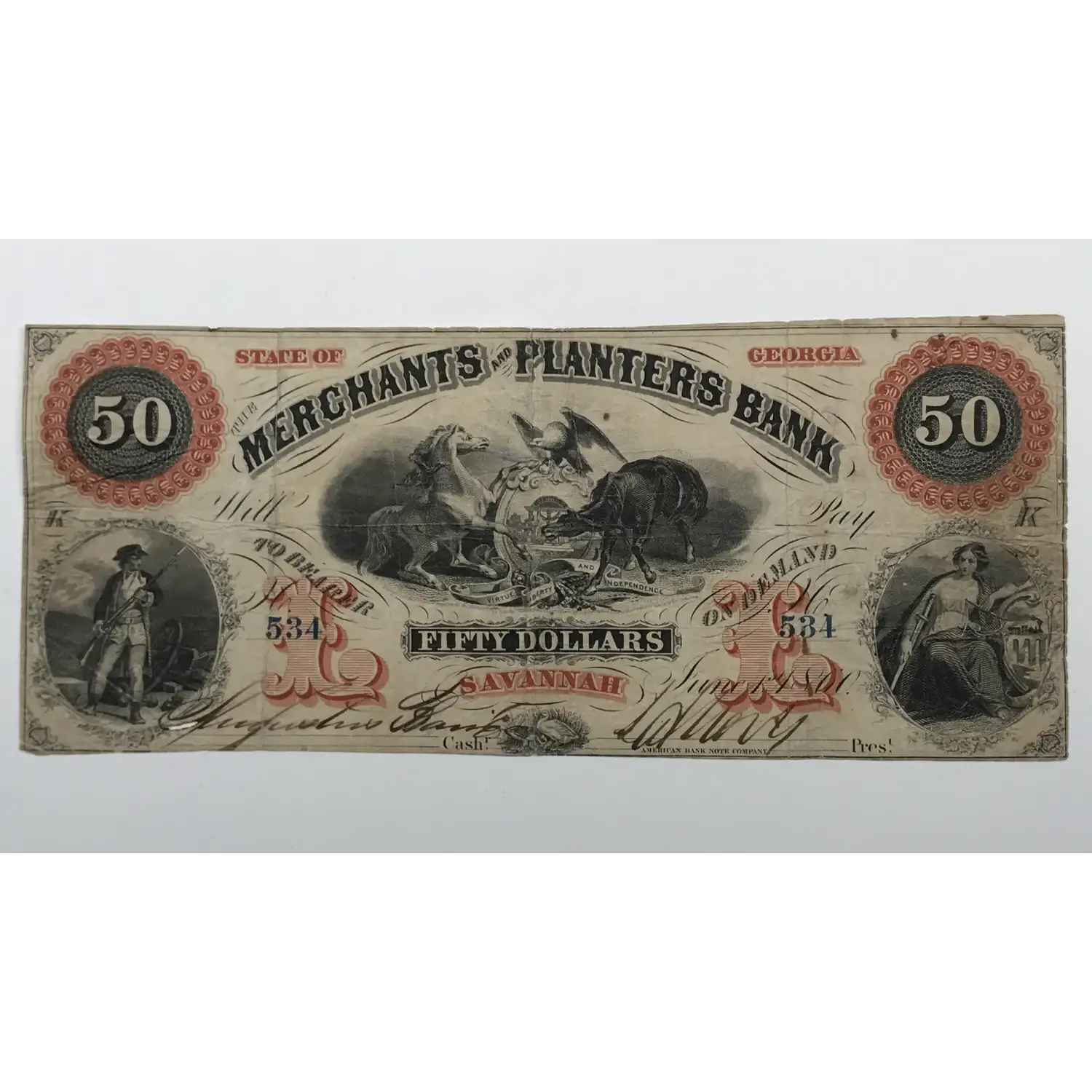 1860 $50 The Merchants & Planters Bank Savannah Georgia Obsolete Currency - creases, pinholes