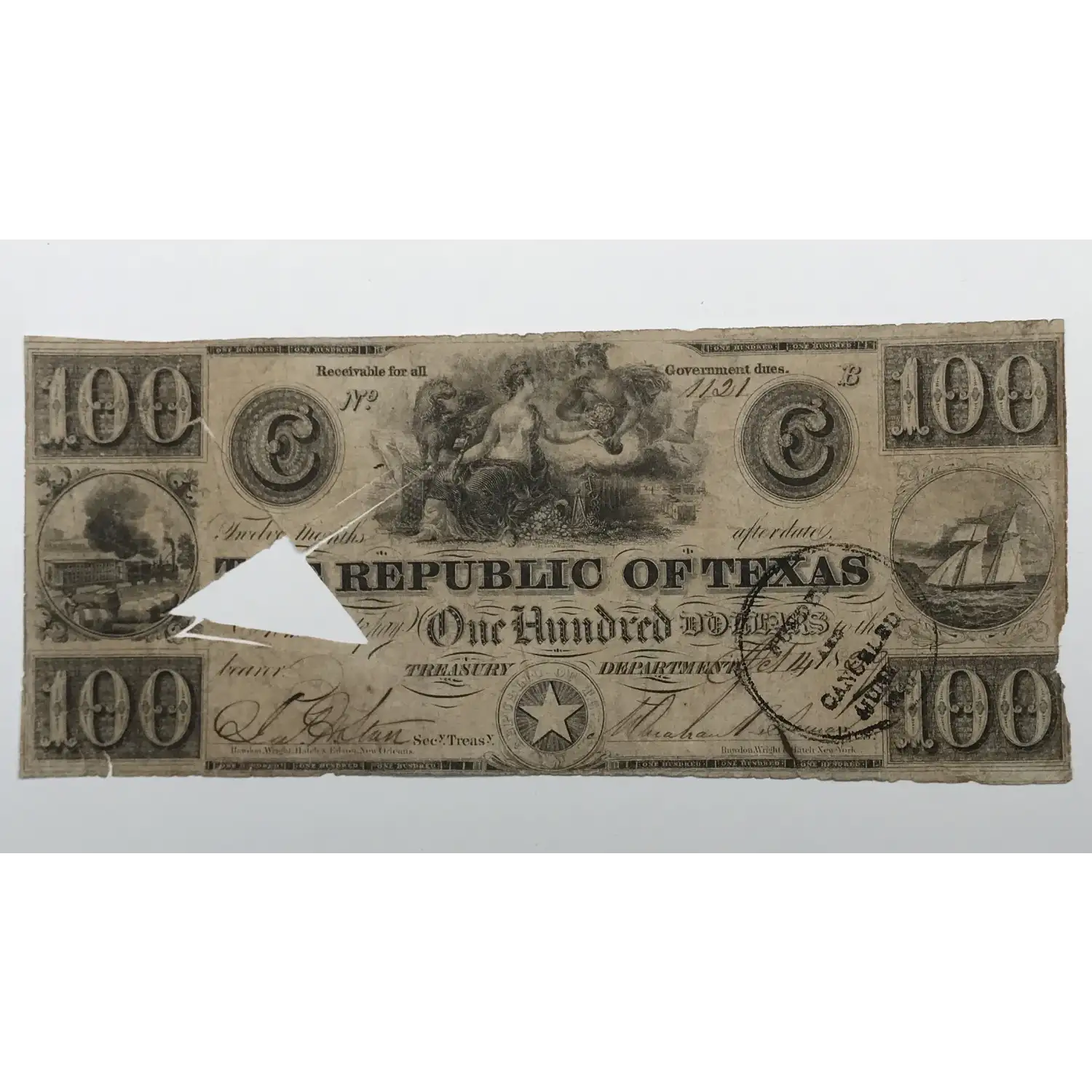 1839 $100 Republic of Texas Obsolete Currency - Stamp/Cut Cancelled