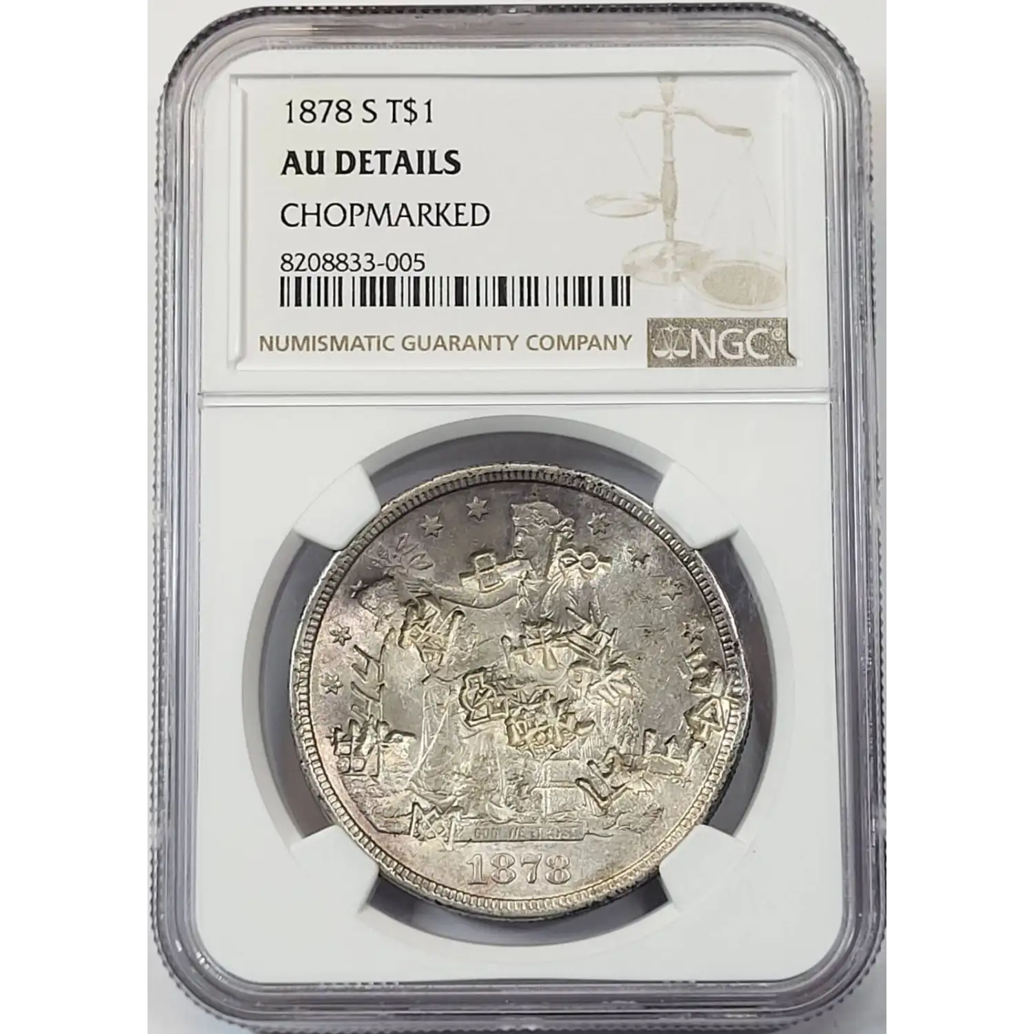 1878 S Trade Silver Dollar NGC AU Details Chopmarked