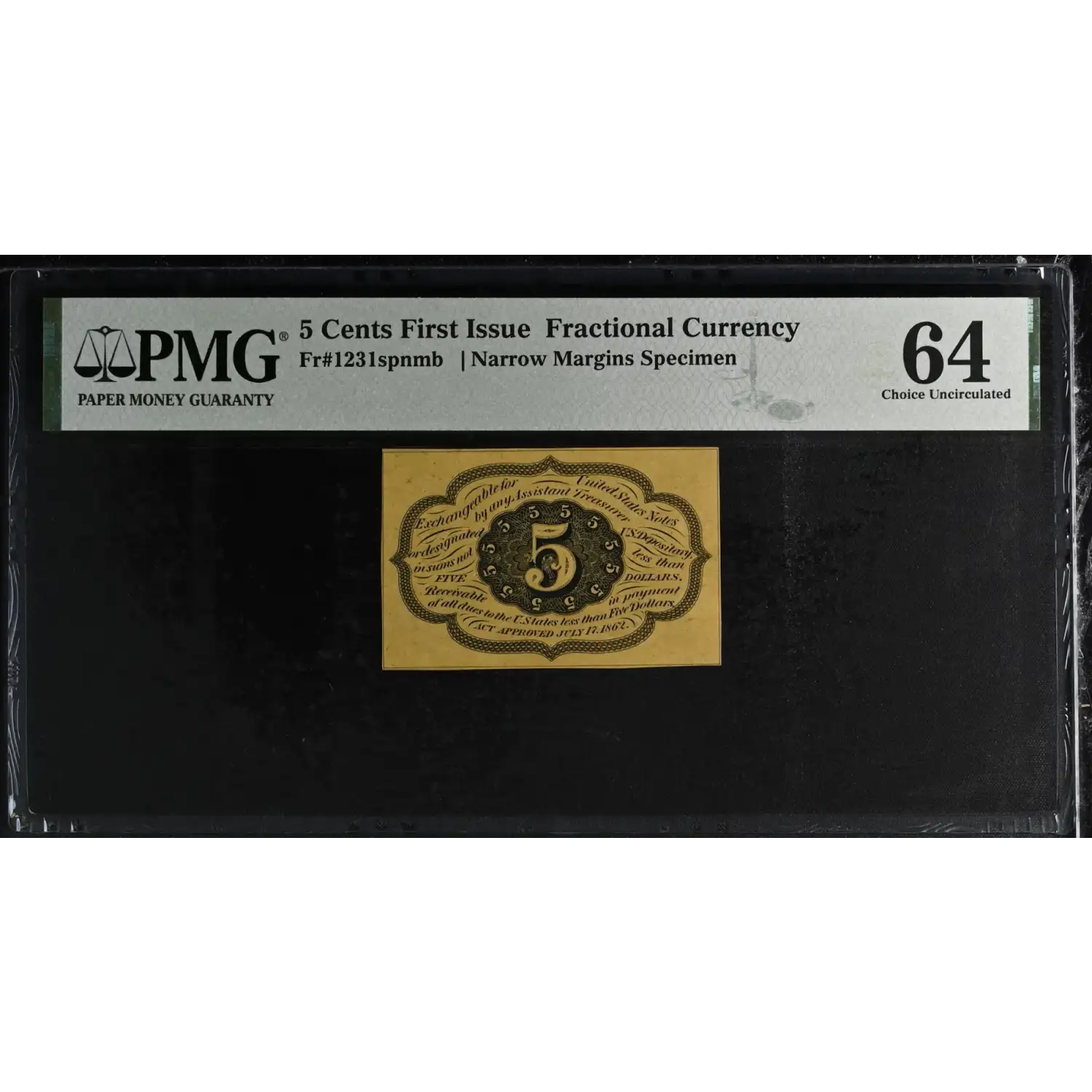 5 Cents First Issue Fractional Currency FR#1231-SP Narrow Margins Specimen PMG CU 64 (glue residue)