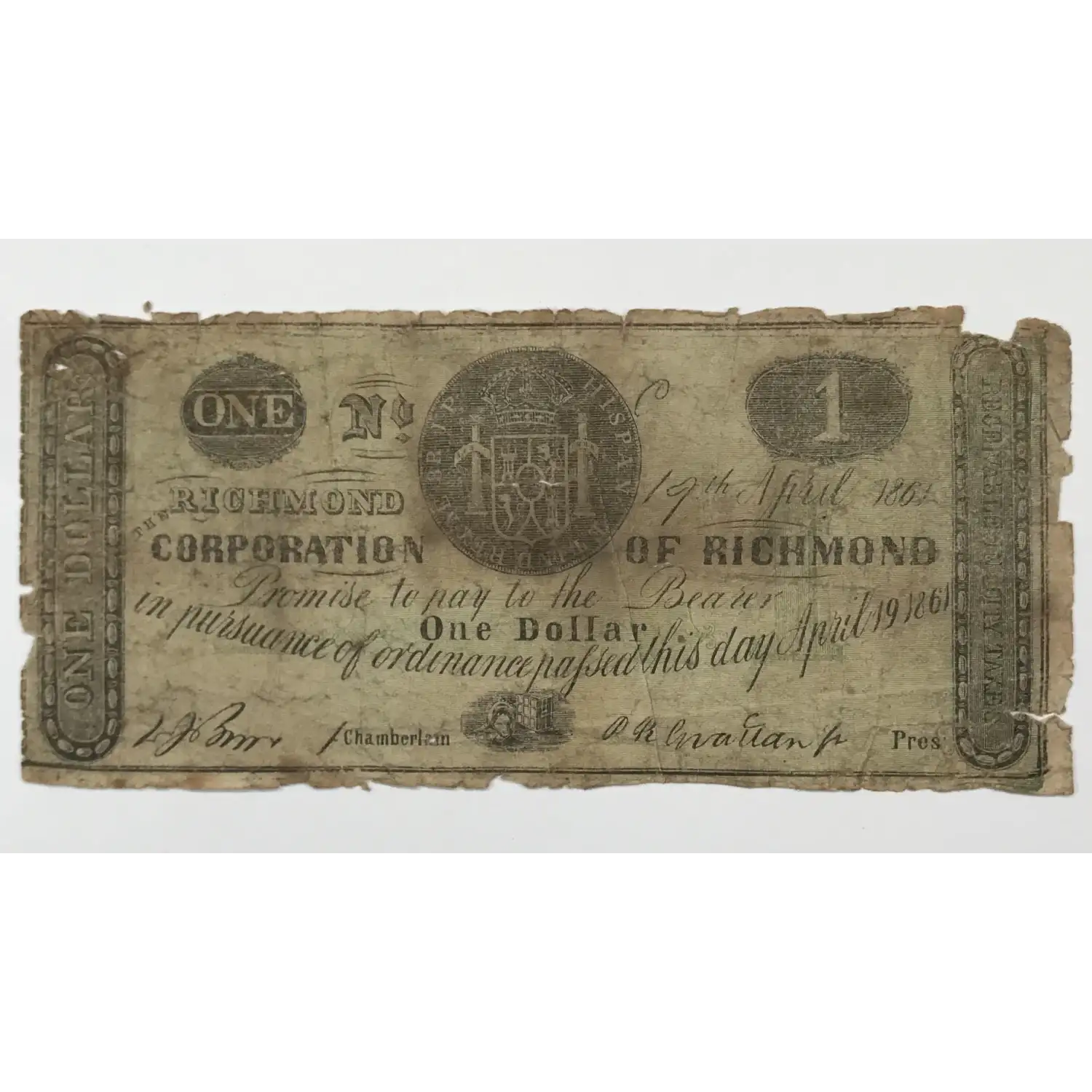 1861 Corporation of Richmond, Virginia One (1) Dollar Note - Obsolete Currency