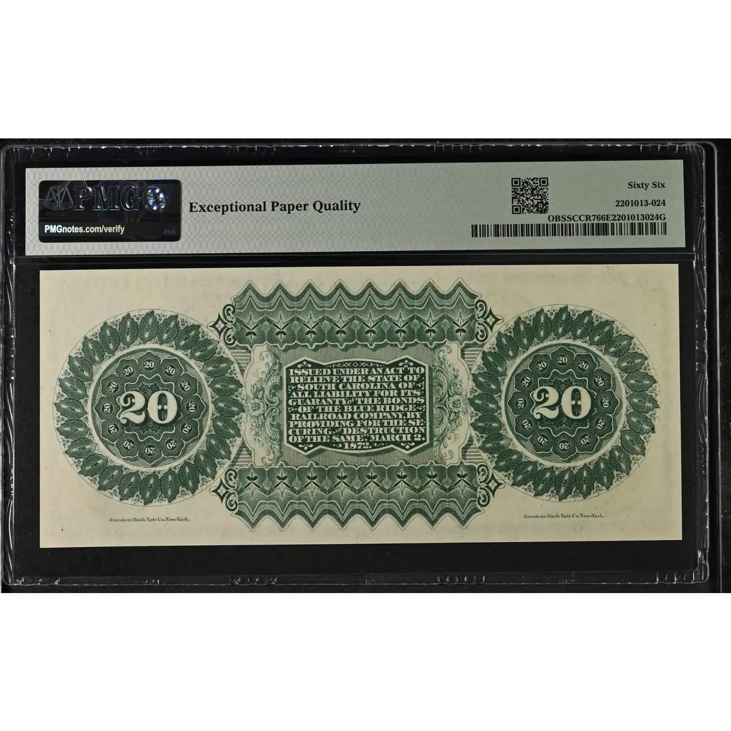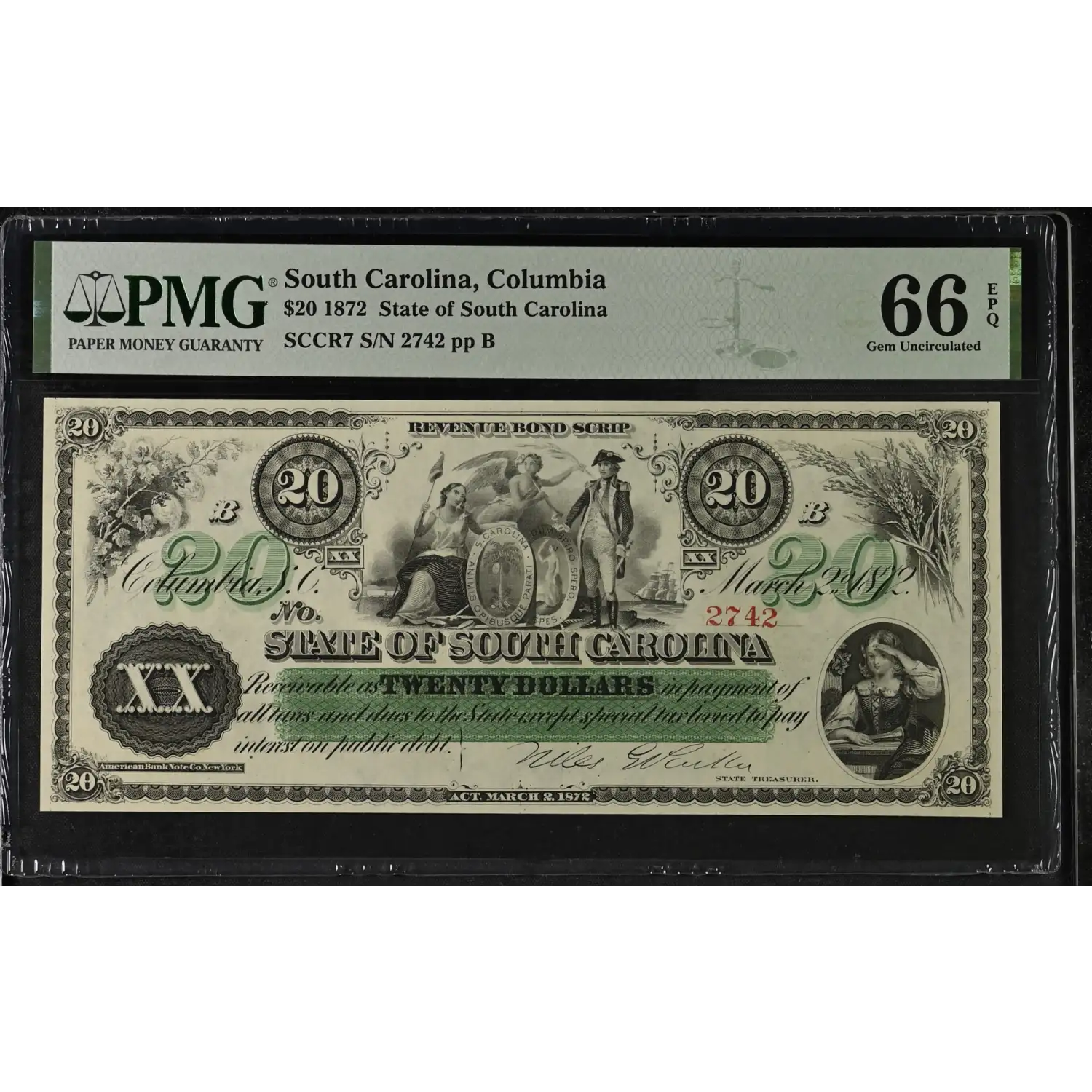 1872 Columbia, South Carolina $20 Note SCCR7 PMG CU 66 EPQ