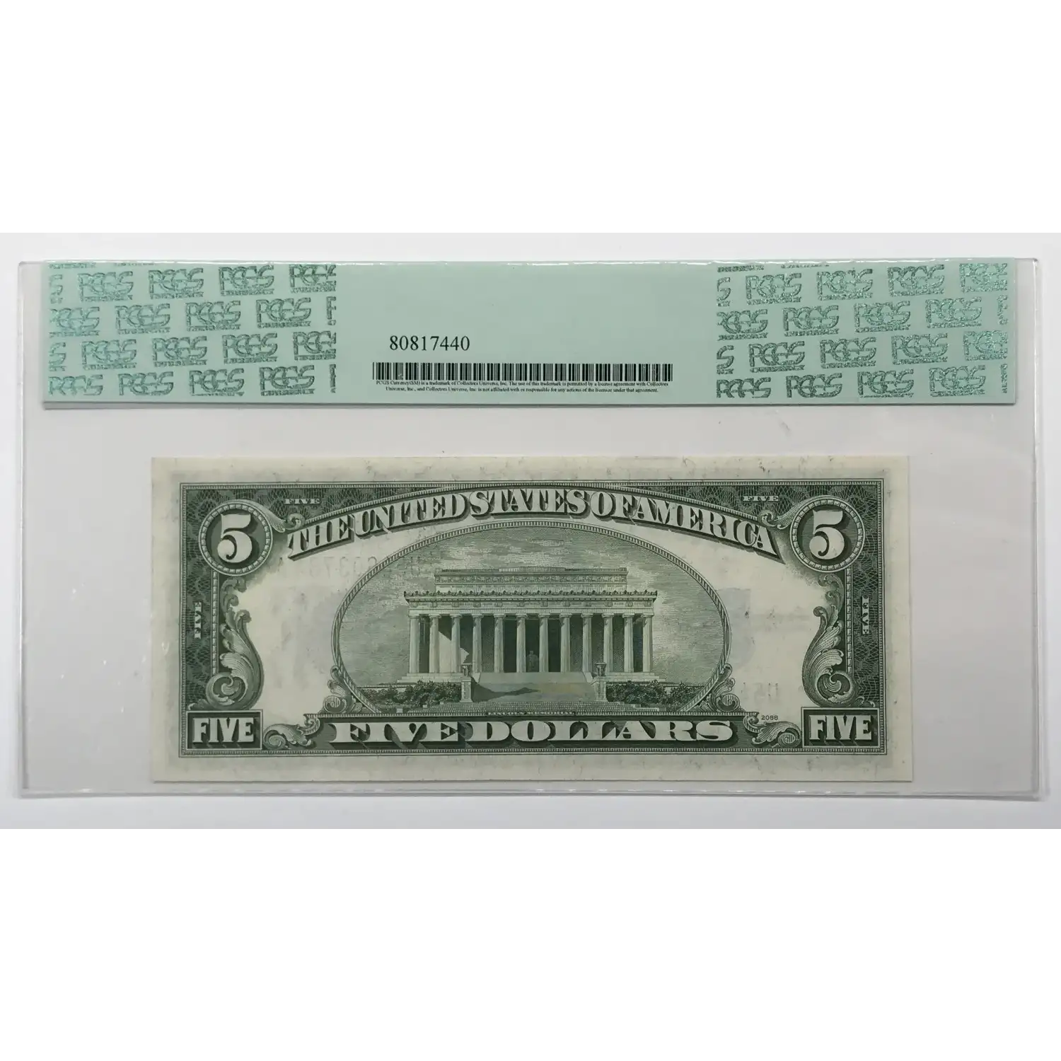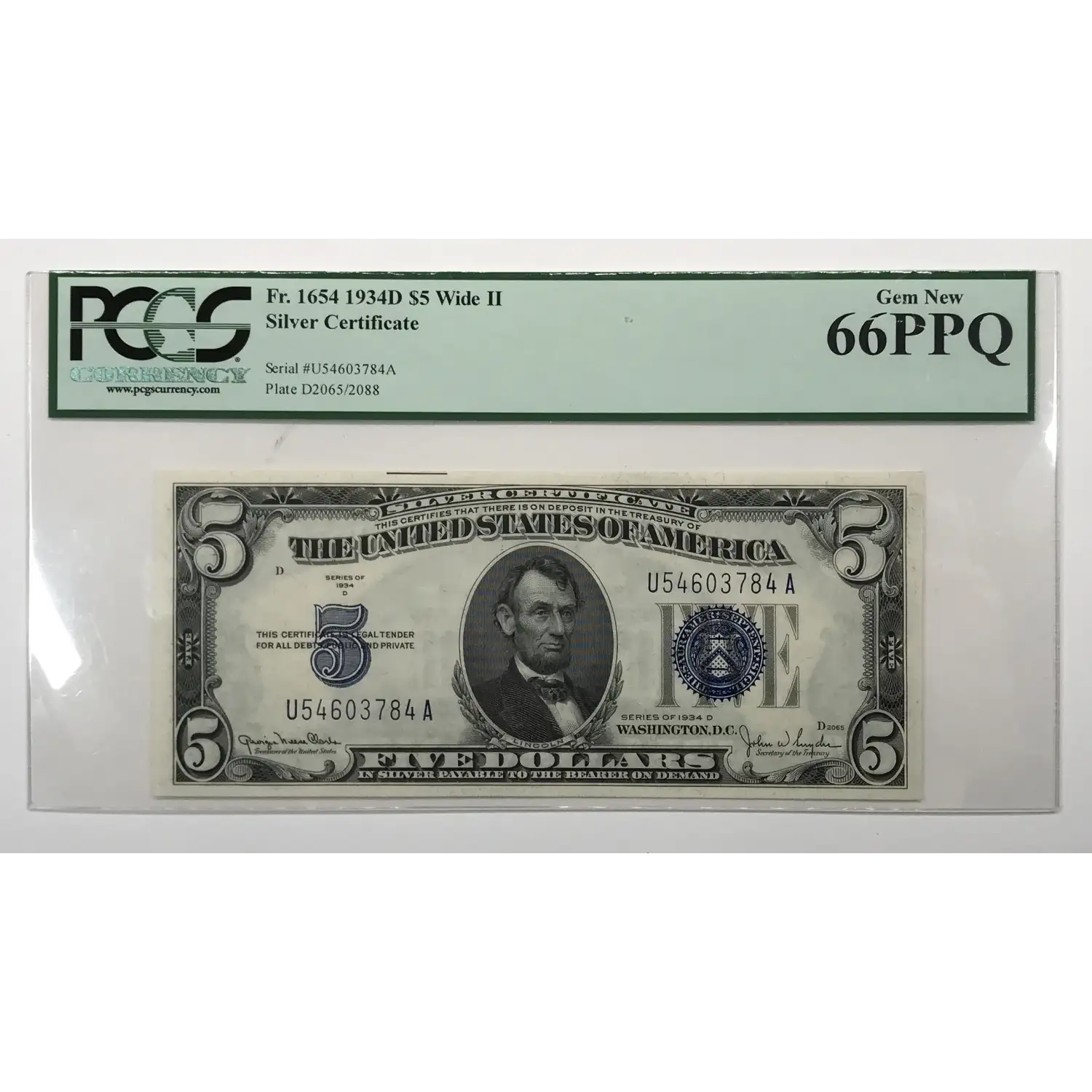 1934-D $5 Wide II Silver Certificate FR#1654 PCGS Currency CU 66 PPQ