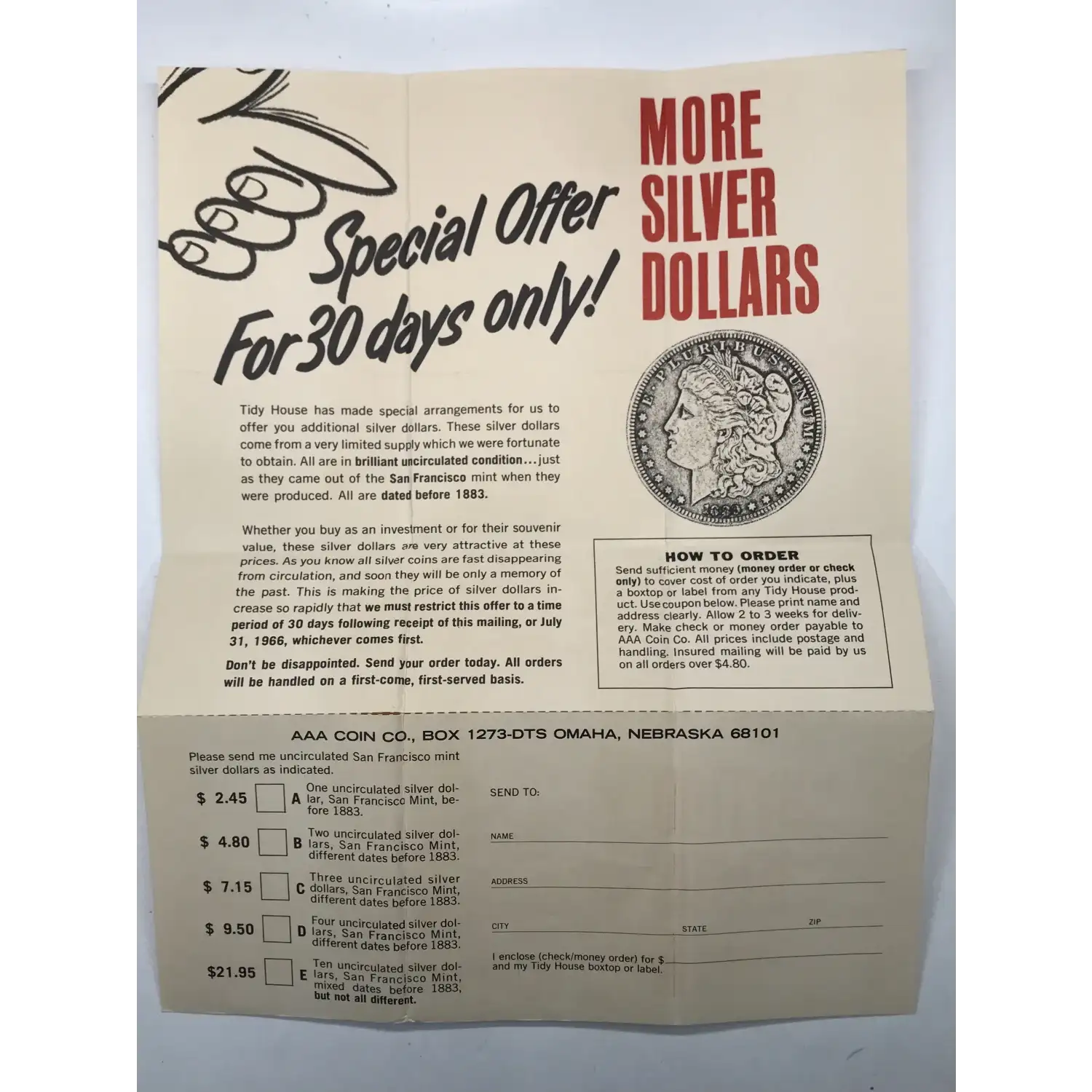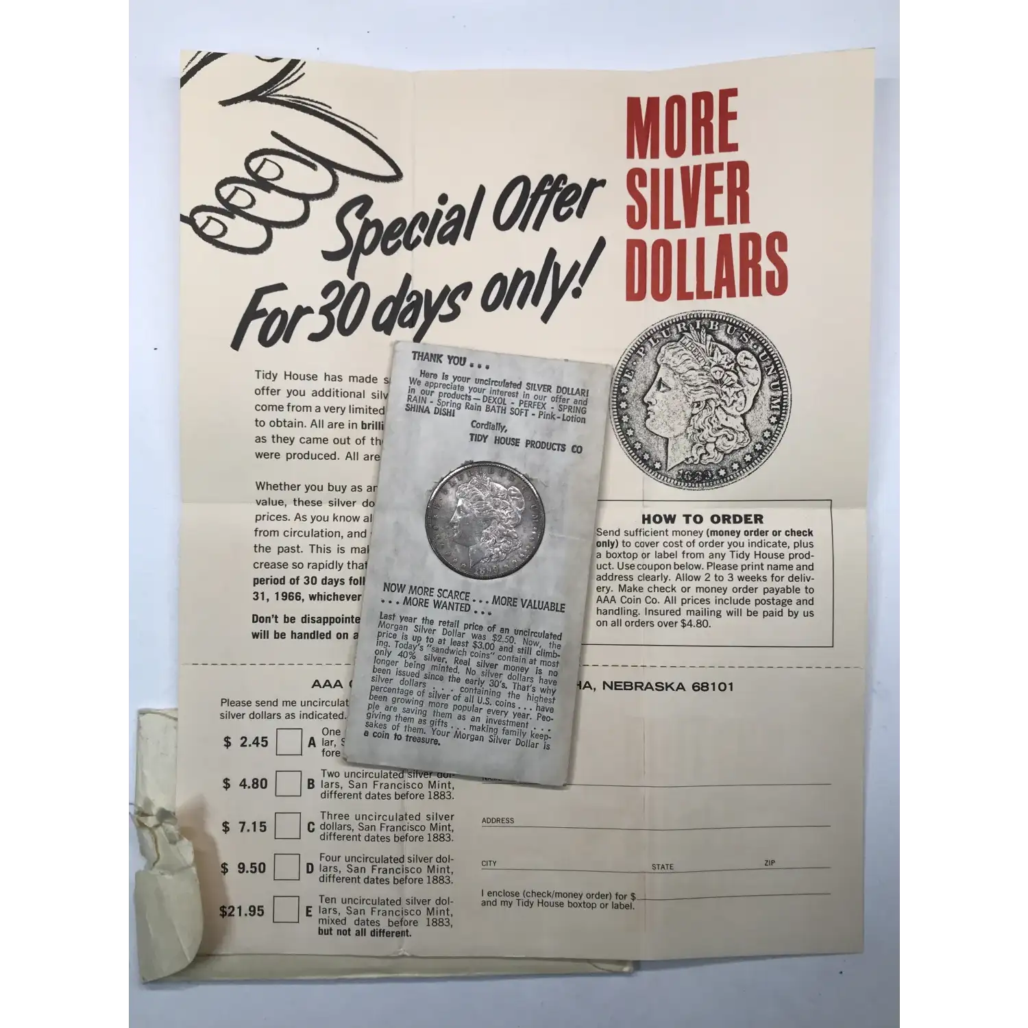 1899-O Morgan Silver Dollar - Tidy House Products Cardboard Holder w Paper & Envelope