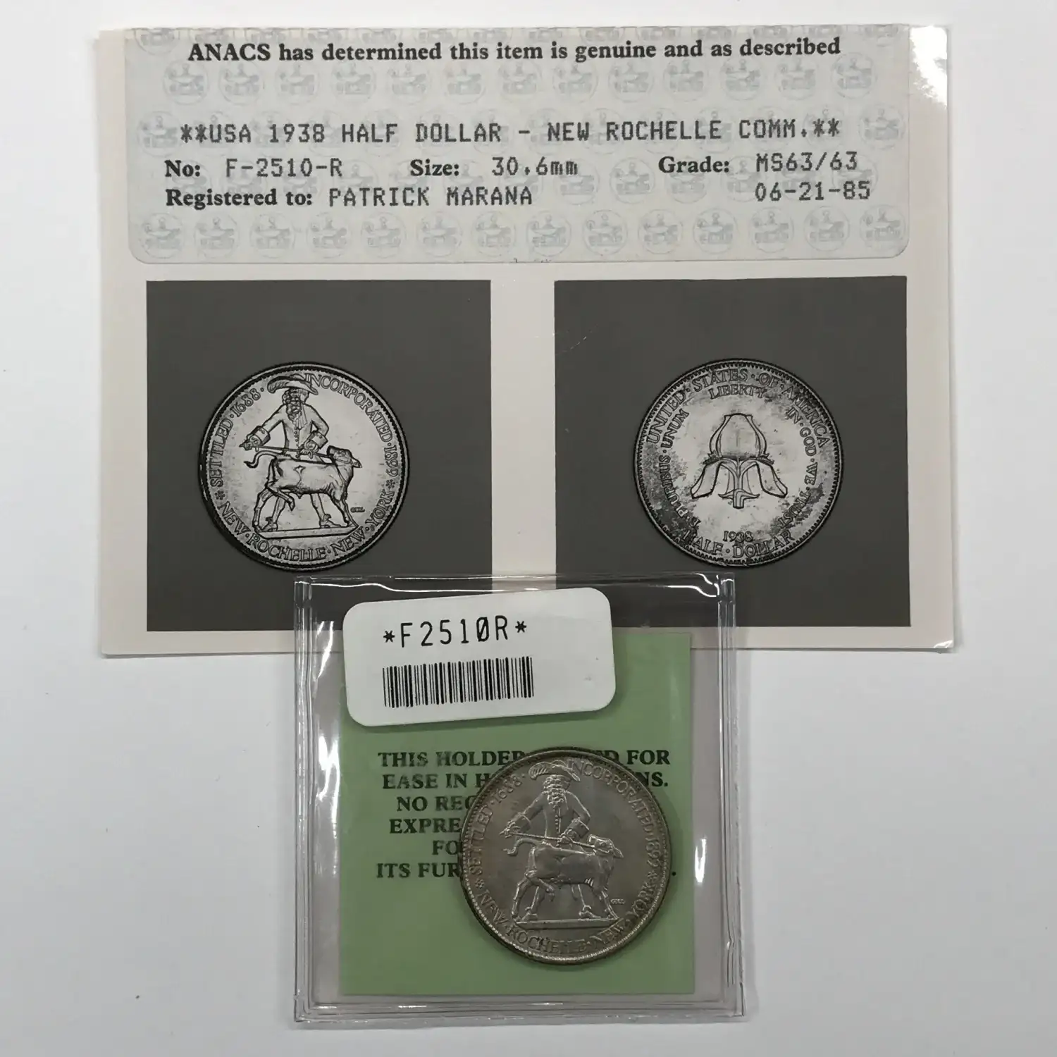 1938 P New Rochelle New York 250th Anniversary Commemorative Half Dollar ANACS MS-63 Vintage Photo Cert Type 6