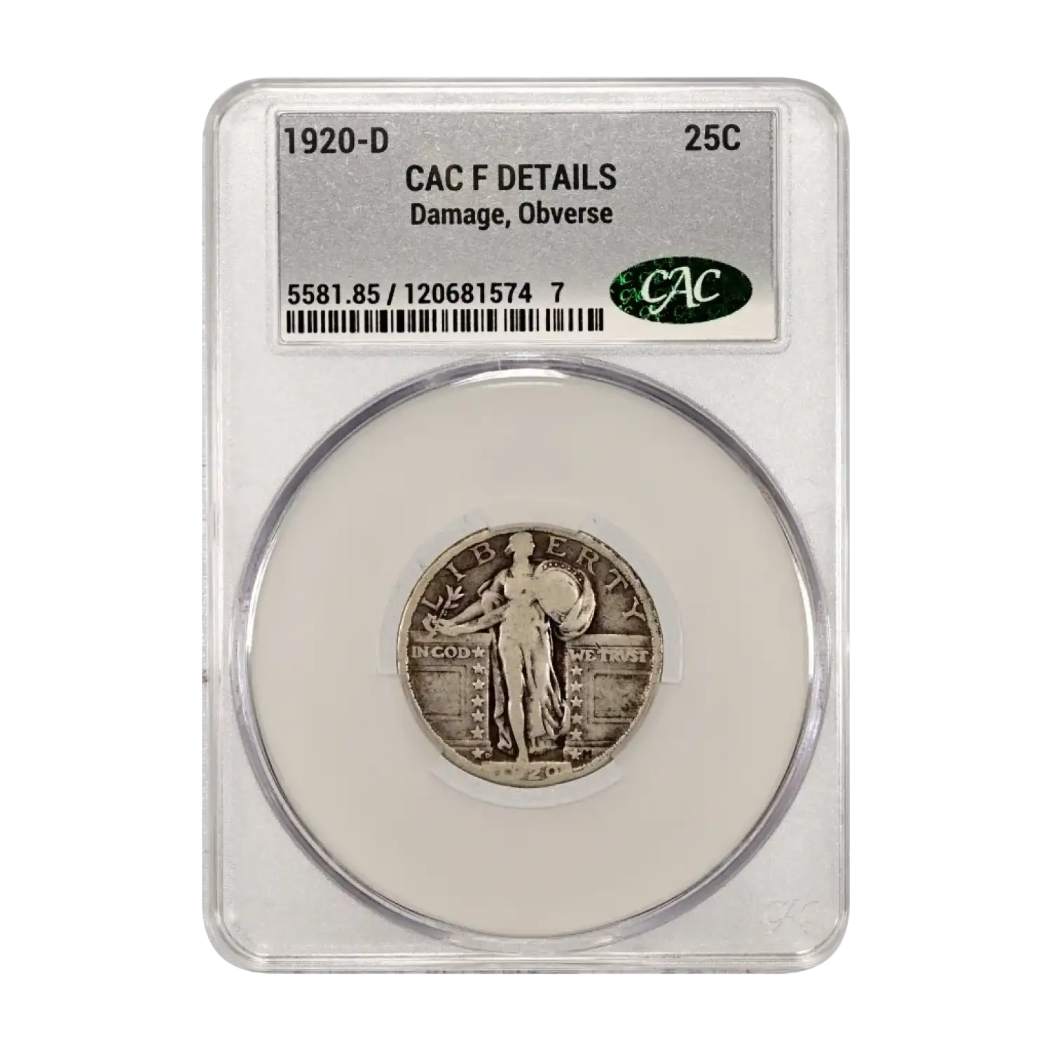 1920-D Standing Liberty Quarter CAC Grading (CACG) F/Fine Details (damage, obverse)