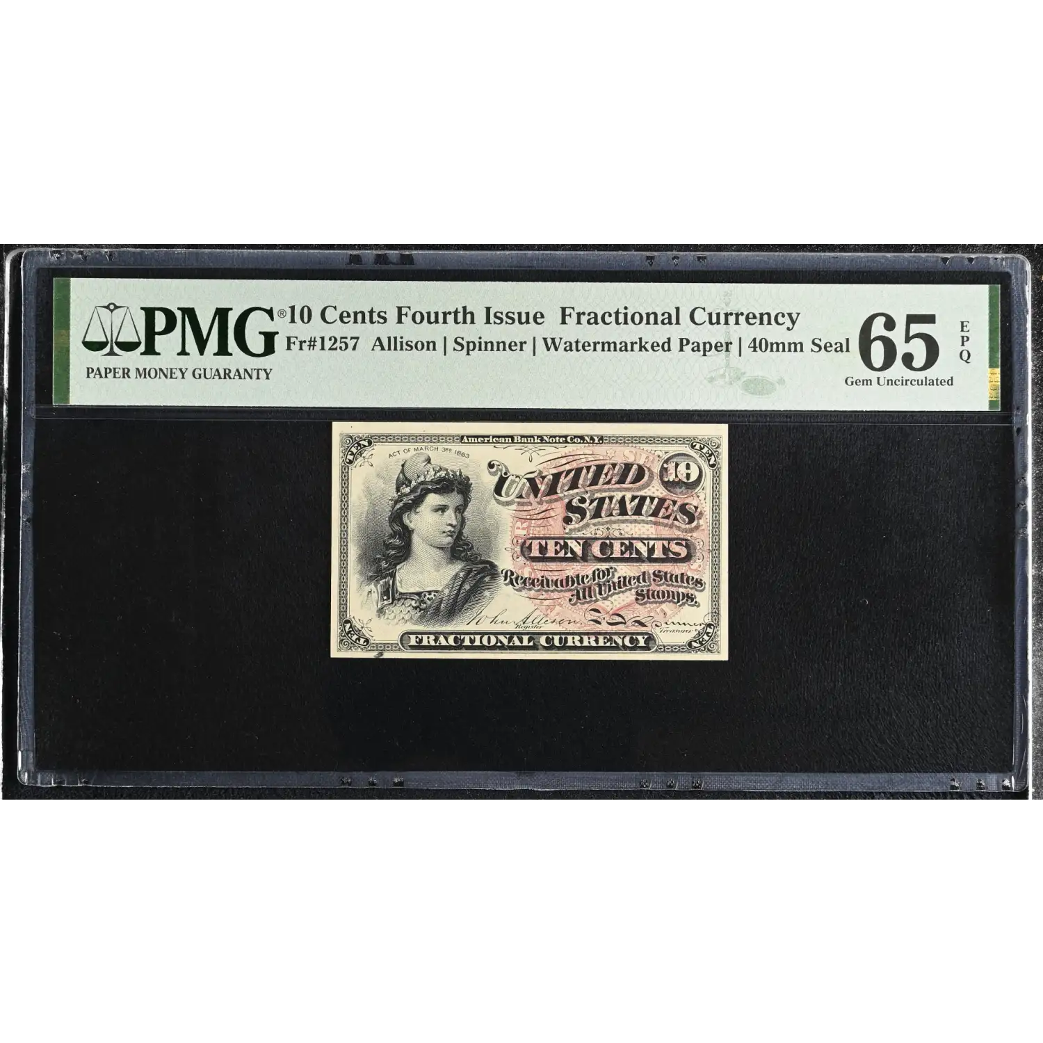 10 Cents Fourth Issue Fractional Currency FR#1257 PMG CU 65 EPQ - Watermarked Paper 40mm Seal