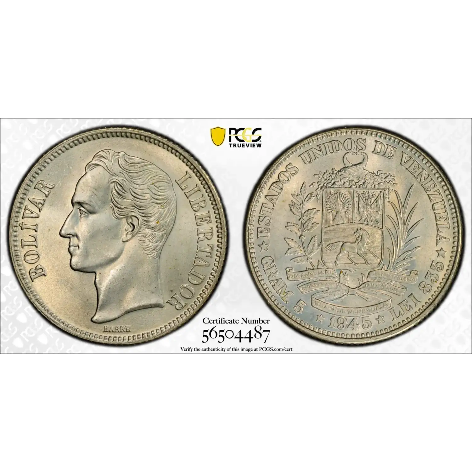 1945 VENEZUELA Silver BOLIVAR (Gram 5) PCGS MS-66