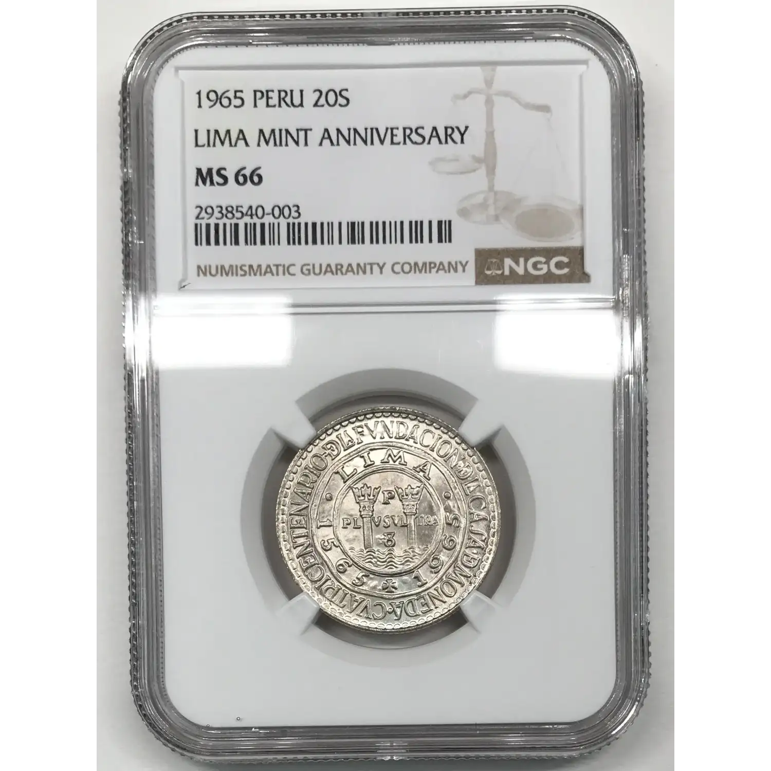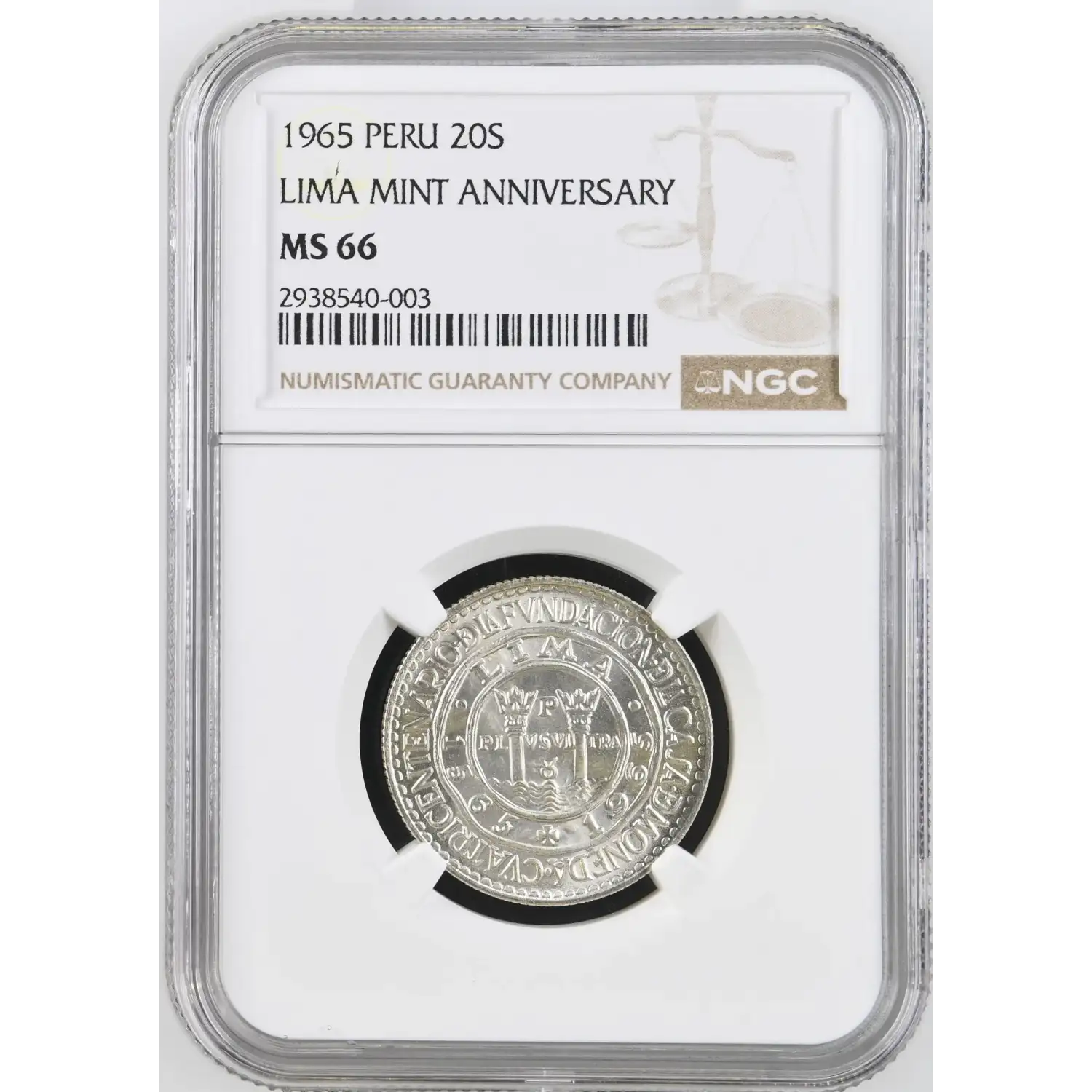 1965 PERU Silver 20 SOLES NGC MS-66 LIMA MINT 400TH ANNIVERSARY