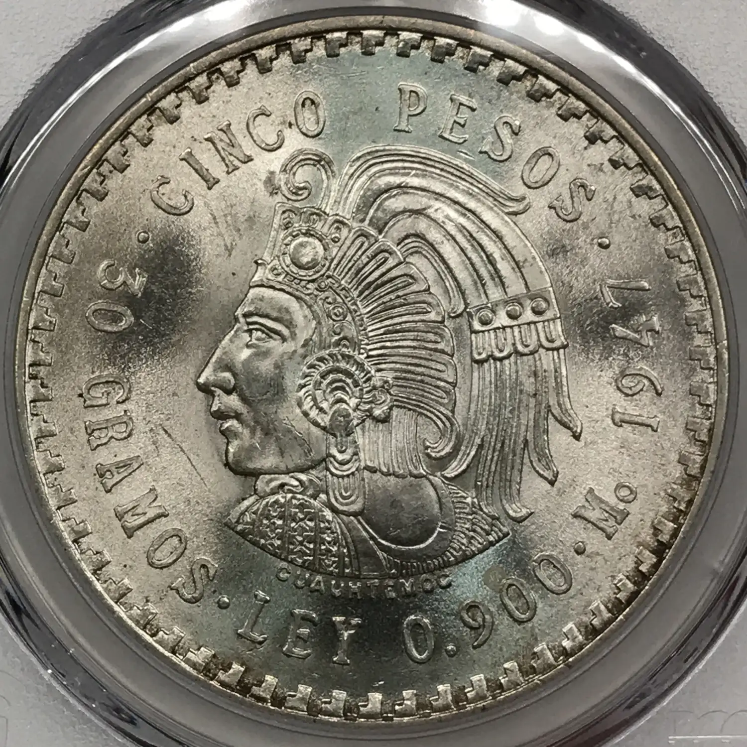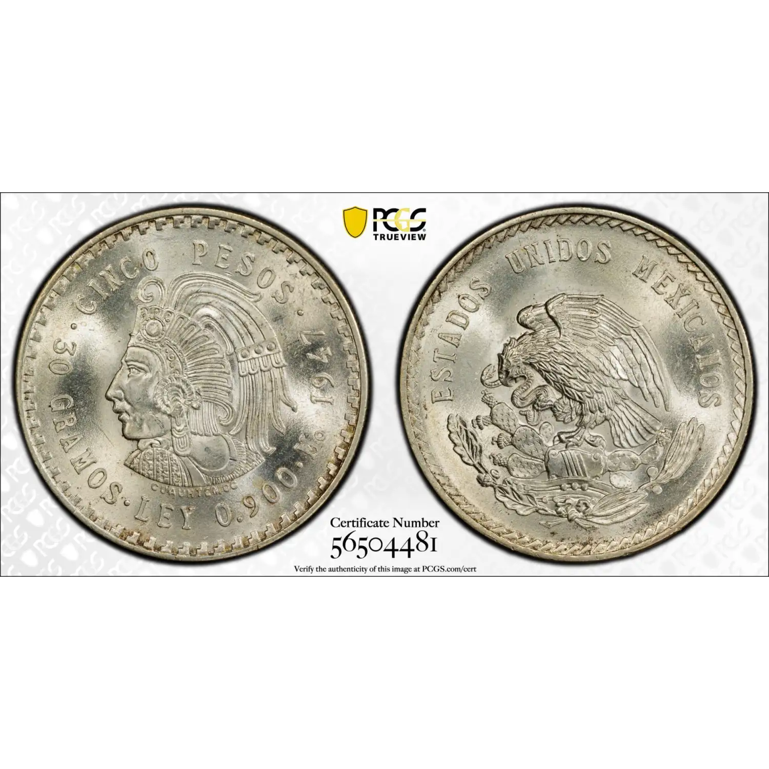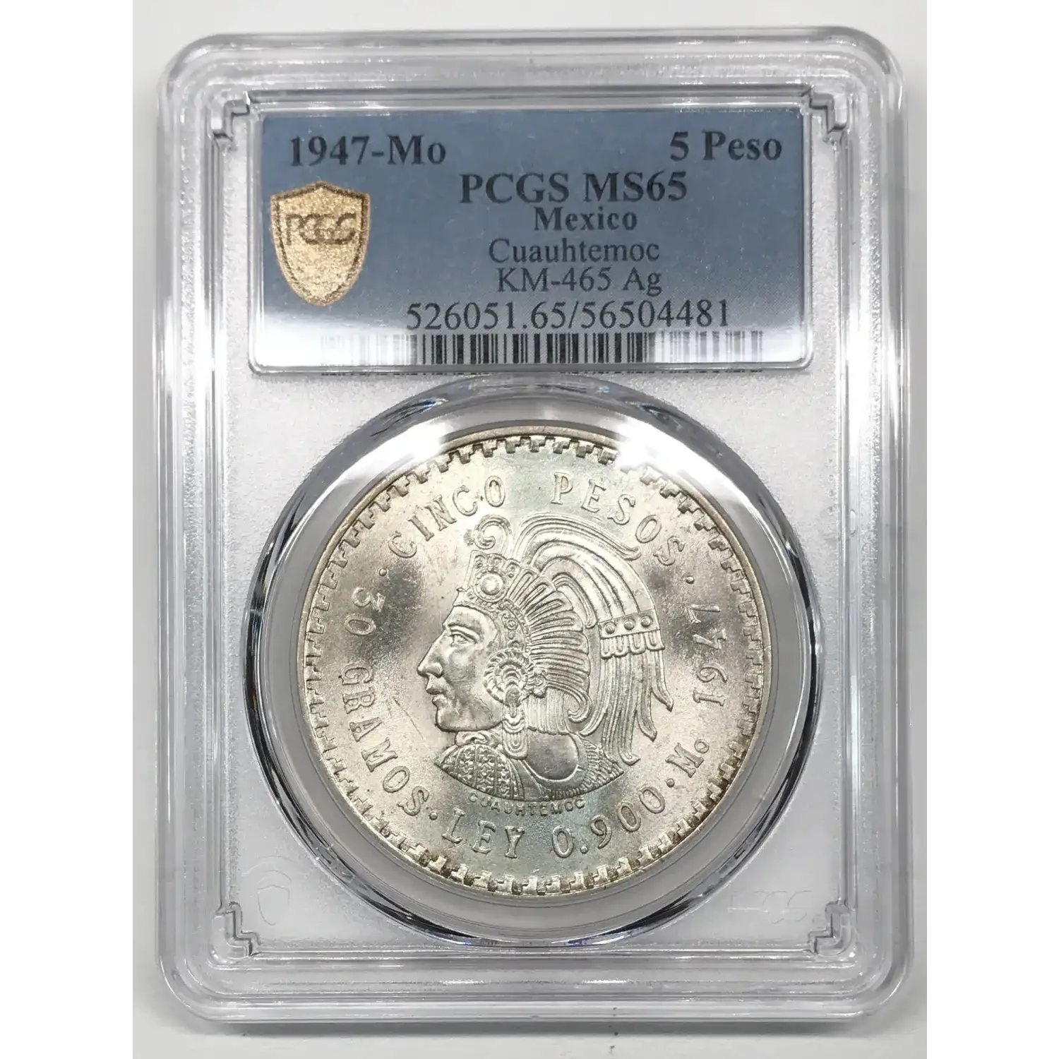 1947-Mo Mexico Cuauhtemoc Silver 5 Pesos PCGS MS-65