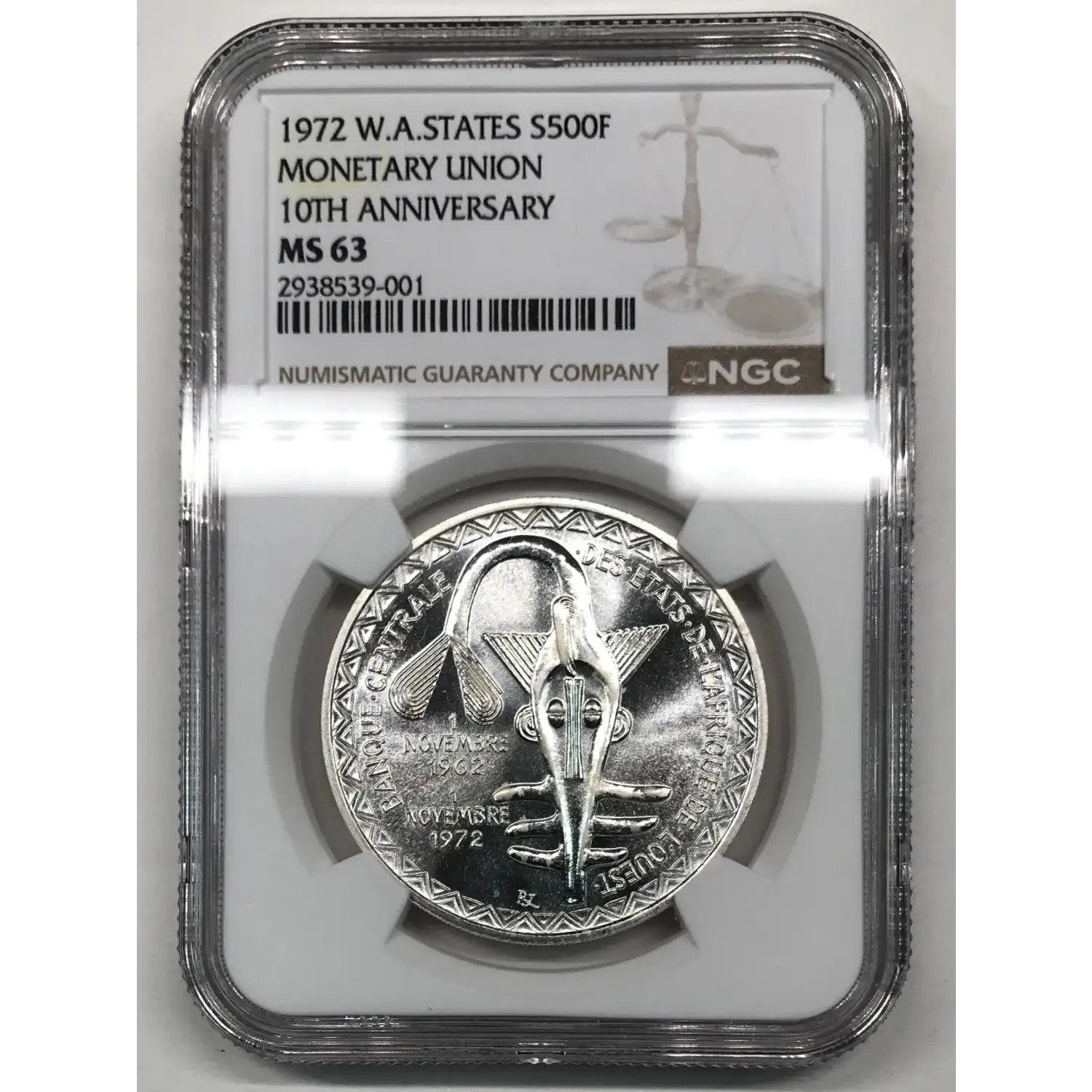 1972 West African States Silver 500 Francs NGC MS-63 - MONETARY UNION 10TH ANNIVERSARY - KM#7