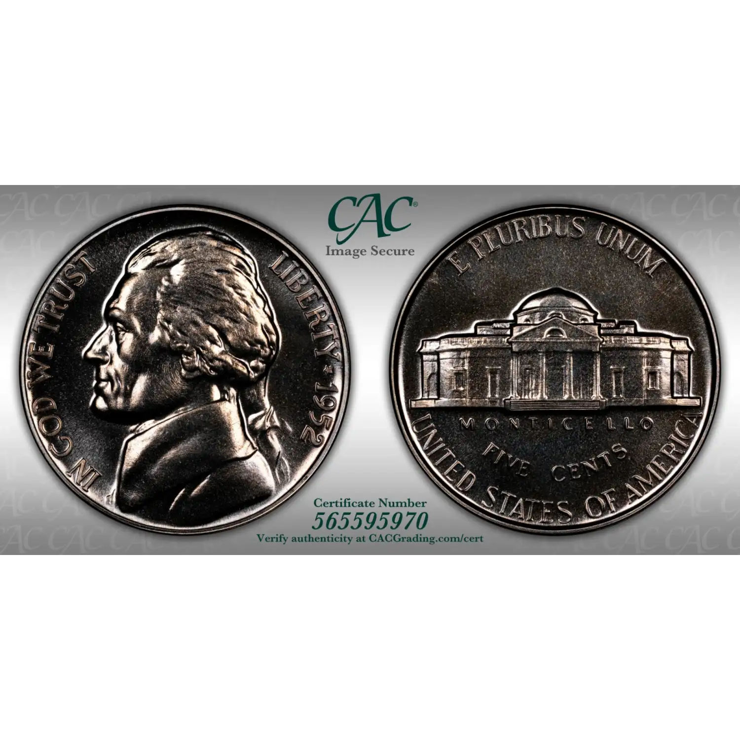 1952 Proof Jefferson Nickel CAC Grading (CACG) PR 65