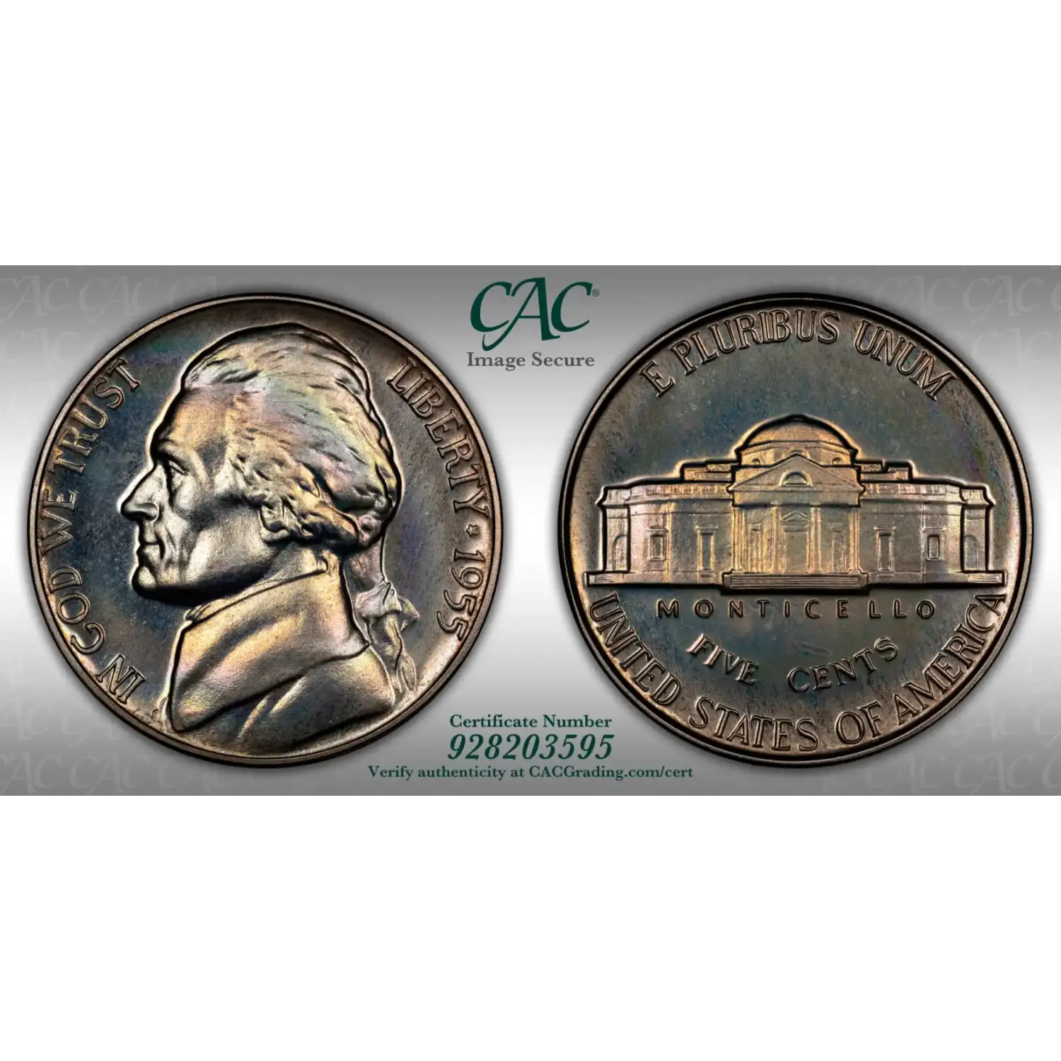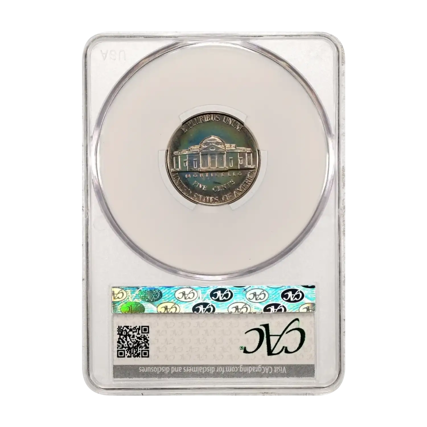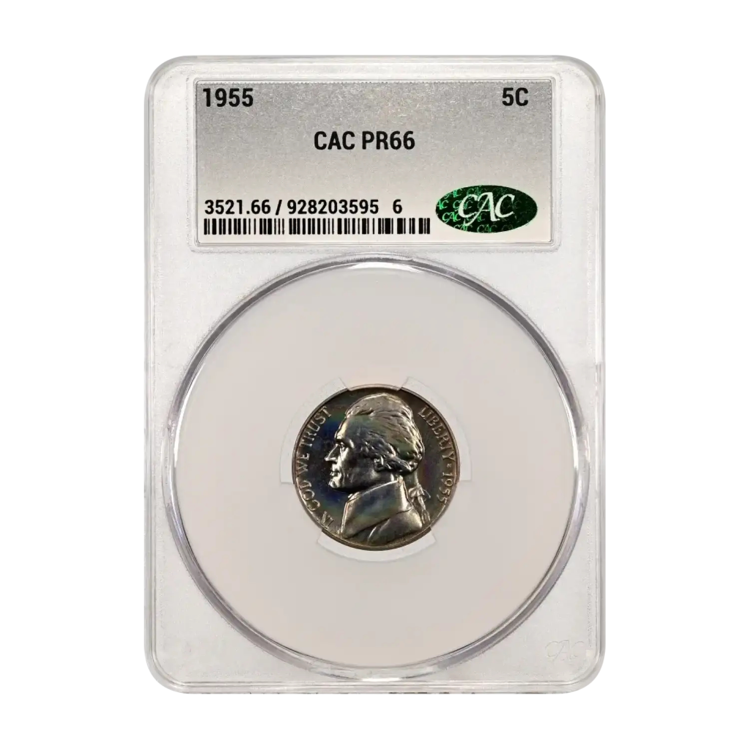 1955 Proof Jefferson Nickel CAC Grading (CACG) PR 66 - Rainbow Toning