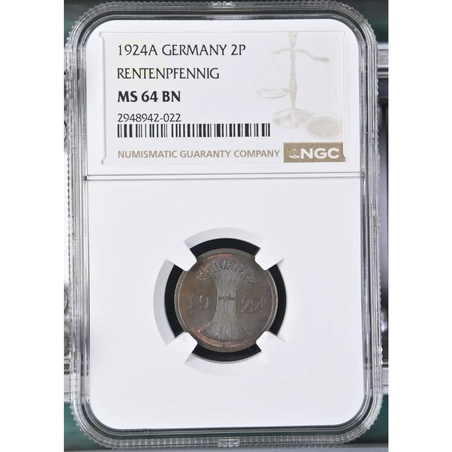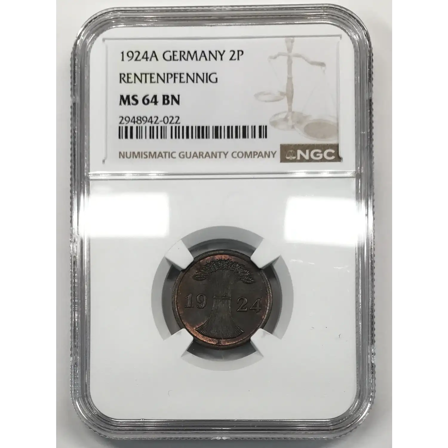1924-A GERMANY WEIMAR REPUBLIC Bronze 2 RENTENPFENNIG (2P) NGC MS-64 BN - KM#31