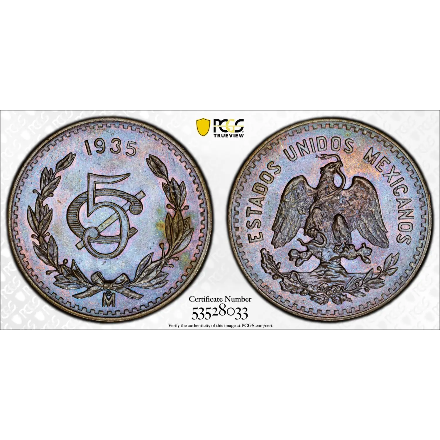 1935-Mo MEXICO Bronze 5 CENTAVOS PCGS MS-65 BN - Blue/Purple Rainbow Toning - KM-422